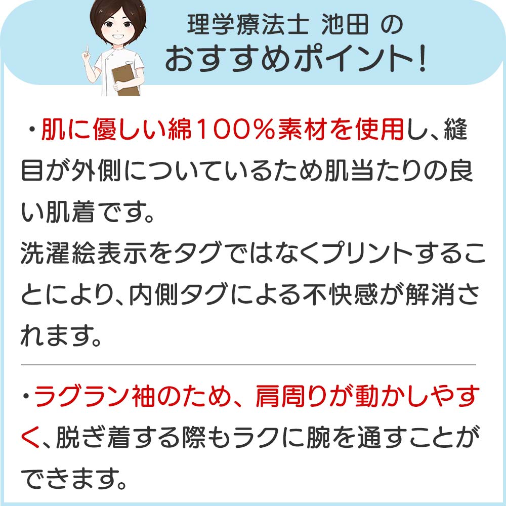 Item Information 肌に優しい綿100% ★3分袖ワンタッチシャツ(2枚組)(婦人) カラー:ピーチ/ホワイト/ラベンダー 対応サイズ 【S】バスト72-80cm 【M】バスト79-87cm 【L】バスト86-94cm 【LL】バスト93-101cm 【3L】バスト100-108cm 【4L】バスト107-115cm 平置きサイズ(cm) 【S】裄丈35・バスト80・着丈66/73 【M】裄丈36・バスト83・着丈68/75 【L】裄丈37・バスト89・着丈70/77 【LL】裄丈38・バスト95・着丈72/79 【3L】裄丈39・バスト101・着丈74/81 【4L】裄丈40・バスト107・着丈76/83 綿100% 日本企画中国製 【理学療法士のおすすめポイント!】 ・肌に優しい綿100%素材を使用し、縫目が外側についているため肌当たりの良い肌着です。 洗濯絵表示をタグではなくプリントすることにより、内側タグによる不快感が解消されます。 ・ワンタッチテープで留め外しが簡単。 ご自身で脱ぎ着をされたい方におすすめ。 面ファスナー部分を合わせるだけなので、留め外しが簡単にでき、介助する側もされる側も負担が軽減されます。 ・後ろ見頃が長めなため、腰や背中が曲がってきた方でも背中が見えにくい安心仕様。 ・ラグラン袖のため、肩周りが動かしやすく脱ぎ着する際もらくに腕を通すことができます。 ※接着力維持のため、洗濯の際はワンタッチテープを留めて洗ってください。 ※商品画像は出来る限り現物の色味に調整しておりますが、ご覧になっているモニター・PC環境により実際の商品と色味が異なって見える場合がございます。ご了承の上お買い求め下さい。 sa3510-035-98003(241025-o) 関連ワード [名前入れ無料]シニア レディース インナー 婦人 肌着 前開き肌着 ワンタッチテープ 後ろ長め肌着 婦人下着 ラグラン シャツ 婦人用 高齢者 70代 80代 90代 施設 入居準備 介護用品 大きいサイズ インナー コットン100% 綿100肌着 介護肌着 シニア 婦人 肌着 肌着 レディース 高齢者 介護 肌着 前開き 女性 婦人肌着 高齢者 シニアファッション レディース 婦人服 大きいサイズ 80代 女性 洋服 90代 せたがや介護はじめての方へ最初は1〜2着からお試しください