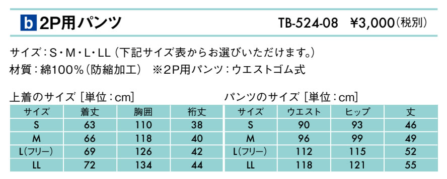 製品の仕様 サイズ S・M・L(フリー)・LL カラー 白・グリーン・ブルー・ピンク・イエロー・キャメル・ブラウン・キャメル・ブラウン 仕様 材質:綿100%(防縮加工) 配送について 大型商品(大型宅配便)について お届けは玄関の前まで、ビルやマンションの場合は共同玄関口までの配達となります。配達員は1名でお伺いをいたしますので、トラックからの荷下ろし、 搬入が困難な場合、お客様にお手伝いをお願いしております。 再配達について 路線便での配送となるため、不在時の持ち帰りや再配達の際に別途費用が発生します。ご不明な点はお問い合わせください。 搬入・設置組立について 時間指定や階段を利用しての搬入、設置組立をご希望の場合も別途費用が発生します。必要な場合は予めご相談ください。 個人宅への配送について ご注文時の備考欄に(施設名・屋号・予定名称)をご記入ください。お届け先が個人様宛の場合、別途送料が必要です。 北海道・沖縄・離島へのお届けについて 追加送料が発生します。法人様につきましても追加送料分のご負担が必要です。 サポート情報 ※メーカー希望小売価格はメーカーカタログに基づいて掲載しています。TB-524-08 2P用パンツ 国内工場・受注生産。高田ベッドの患者着用2P用パンツです。綿100%防縮加工済み。※サイズ表記のウエストは、伸縮可能な最大サイズです。最小サイズは商品により異なりますのでお問い合わせください。 綿カラーは7色からお選びいただけます。 高田ベッド製作所正規特約店のエンバシーで安心をプラス! 関連商品はこちら(孔加工の有無やサイズ違い、オプションなど) 2PDX用上着 2PDX用上着(バストパット付き) ご注文はこちらから