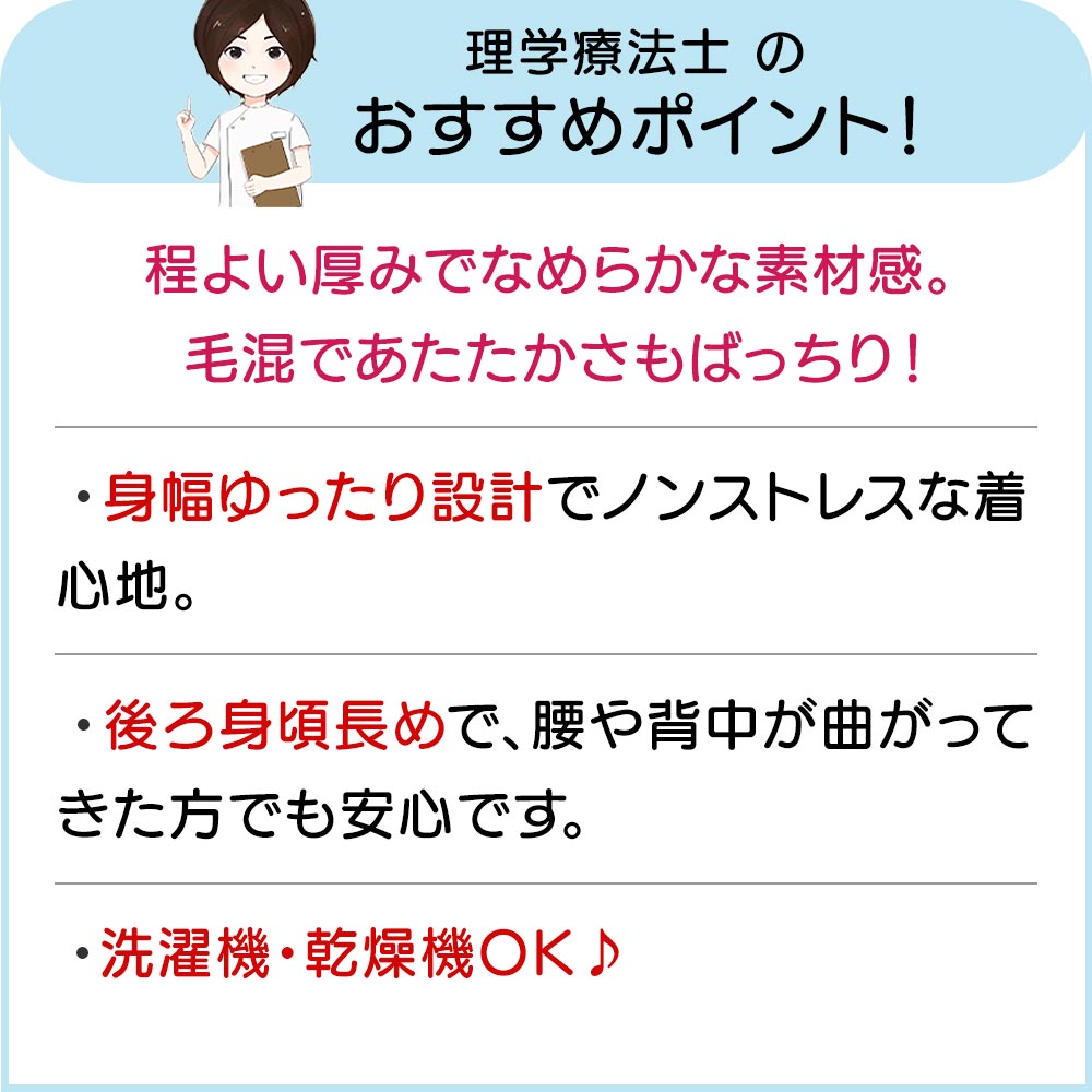 Item Information 開け閉め簡単 ★乾燥機対応なめらか毛混ワンタッチテープニットベスト ベージュグリーン/モカ/パープル/グレー 対応サイズ 【M-L】バスト79-94cm 平置きサイズ(cm) 【M-L】肩幅38・袖丈15・バスト96・着丈61/67 アクリル95%・毛5% 日本企画中国製 【理学療法士のおススメポイント!】 ・程よい厚みでなめらかな素材感。毛混であたたかさもばっちり! ・身幅ゆったり設計でノンストレスな着心地。 ・後ろ身頃長めで、腰や背中が曲がってきた方でも安心です。 ・洗濯機・乾燥機OK ※商品画像は出来る限り現物の色味に調整しておりますが、ご覧になっているモニター・PC環境により実際の商品と色味が異なって見える場合がございます。ご了承の上お買い求め下さい。 ※生地の裁ち方により、レースや柄の位置が変わる場合がございます。ご了承の上ご購入をお願い致します。 尚、レースや柄の位置の件についての返品・交換は固くお断りいたします。 sa3643-035-821934(250902-k) 関連ワード なめらか毛混ワンタッチテープベスト M-L シニア レディース 大きいサイズ シニアファッション レディース 腰曲がり 高齢者 女性服 婦人服 80 代 服 ベージュグリーン モカ パープル グレー 長袖 乾燥機 シニアファッション レディース 婦人服 大きいサイズ 80代 女性 洋服 90代 誕生日プレゼント 女性 大きいサイズ シニア レディース おばあちゃん 服 祖母 服 70代 ファッション 介護向けファッション 高齢者向けファッション 介護衣料 介護ファッション リハビリ 服 女性 おしゃれ着 プチギフト 贈り物 シニア 服 女性 せたがや介護はじめての方へ最初は1〜2着からお試しください