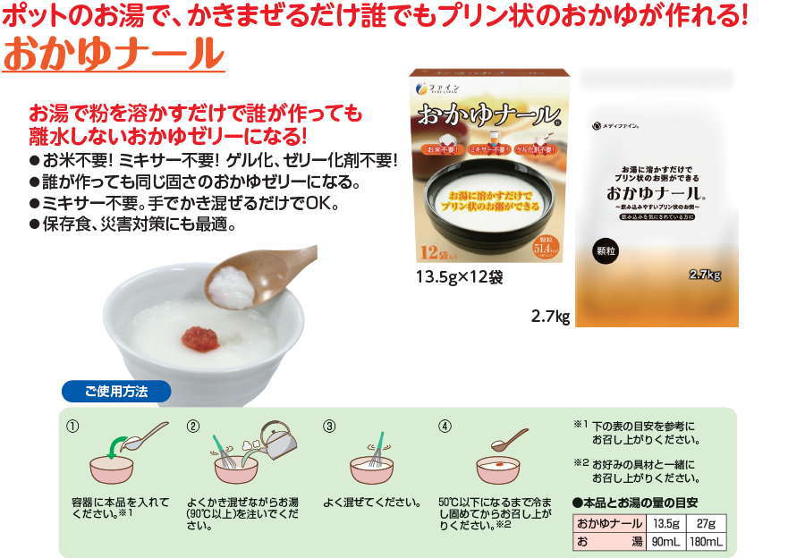 商品の仕様 ●原材料/米粉(米(国産))、澱粉分解物/ゲル化剤(増粘多糖類)、酵素、CMC-Na ●栄養成分/(13.5g当たり)エネルギー51.4kcal、たんぱく質0.95g、脂質0.09g、炭水化物11.7g、食塩相当量0.1g、カリウム13.1mg、リン7.8mg ●栄養機能食品/たんぱく質 ●賞味期限/製造後2年 ●ケース入数/4 商品の説明 ・飲み込みやすいプリン状のお粥。 ・ポットのお湯で、ミキサーを使わずに手攪拌で飲み込みやすいプリン状のお粥が手軽に作れます。 ・プリン状のお粥をワンステップ簡単調理。 ・ミキサー不要。 ・国産の米粉使用。