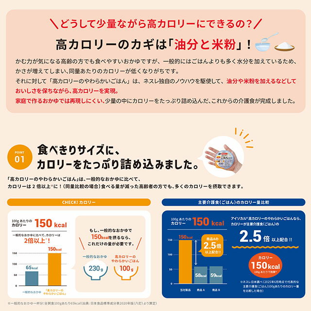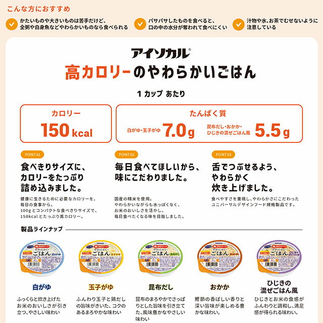 移し替え不要!カップのまま食べられるネスレのおいしい介護食。 舌でつぶせる「やわらかいごはん」で手軽にカロリー補給。 少量でたっぷり150kcal 白がゆ・玉子がゆ…たんぱく質7.0g/昆布だし・おかか・ひじきの混ぜごはん風…たんぱく質5.5g 食べきりサイズにカロリーをたっぷり詰め込みました。 「高カロリーのやわらかいごはん」なら、一般的なおかゆに比べてカロリーは2倍以上に!(※同量比較の場合) 食べる量が減った高齢者の方でも、多くのカロリーを摂取できます。 国産の精米を使用し、ふっくらと炊き上げお米の旨味をしっかりと引き出しました。 素材の味を活かすことで、毎日食べても飽きのこないシンプルなおいしさに! また、お米本来のシンプルなおいしさで主菜や副菜との相性も良く、そのままはもちろん和食や中華など幅広いジャンルの食事とも合わせていただけます。 【5種類からお選びいただけます】 白がゆ/玉子がゆ/昆布だし/おかか/ひじきの混ぜごはん風 ※梅がゆは終売となりました。 商品名 アイソカル 高カロリーのやわらかいごはん 味 白がゆ、玉子がゆ、昆布だし、おかか、ひじきの混ぜごはん風 入り数 12個入 ユニバーサルフードデザイン区分 区分3:舌でつぶせる 加熱方法 【電子レンジ】 ふたを少し開けて、500Wもしくは600Wで約10~20秒 ・加熱時間の目安は電子レンジの機種やワット数により異なる場合がございますので、様子を見て加減してください。 ・オート加熱不可。 【湯煎】 ふたを開けずにそのままお湯に入れて温めてください。 ※電子レンジ、湯煎どちらの場合も、加熱後は容器や中身が熱くなりますのでご注意ください。 取扱注意事項 本品は湿気・冷蔵を避け、常温で保管してください。 低温で保存すると食感が変化(硬化)したり、風味が劣化したり、お米に含まれる水分が分離(離水)することがあります。 そのような場合は、少し温めてからかき混ぜてお召し上がりください。 食事介助が必要な方に使用される場合は、介助者が嚥下の様子を見守ってください。 原材料に含まれるアレルゲン(28品目中) 白がゆ、昆布だし:豚肉、ゼラチン 玉子がゆ:小麦、卵、大豆、鶏肉、豚肉、ゼラチン おかか:さば、豚肉、ゼラチン ひじきの混ぜごはん風:小麦、大豆、豚肉、ゼラチン 主な原材料 ・白がゆ 精米(国産)、コラーゲンペプチド(豚肉・ゼラチンを含む)、中鎖脂肪酸油、米粉、 還元デキストリン/乳化剤 ・玉子がゆ 精米(国産)、コラーゲンペプチド(豚肉・ゼラチンを含む)、中鎖脂肪酸油、 いりたまご(小麦・卵・大豆を含む)、米粉、還元デキストリン、 チキンエキス調味料(鶏肉を含む)/調味料(アミノ酸等)、トレハロース、乳化剤、 増粘多糖類、カロチノイド色素 ・昆布だし 精米(国産)、なたね油、コラーゲンペプチド、昆布だし、米粉、還元デキストリン、 昆布エキスパウダー、食塩/乳化剤、調味料(アミノ酸) ・おかか 精米(国産)、なたね油、コラーゲンペプチド、米粉、還元デキストリン、風味調味料 (かつお)、かつお節粉末、食塩、魚類混合粉末/調味料(アミノ酸等)、乳化剤、酸味料 ・ひじきの混ぜごはん風 精米(国産)、なたね油、コラーゲンペプチド、下茹でにんじん、つゆ、米粉、還元デキ ストリン、乾燥ひじき、食塩/調味料(アミノ酸等)、乳化剤 生産国 日本 メーカー名 ネスレ日本株式会社 ネスレヘルスサイエンスカンパニー 東京都品川区東品川2-2-20