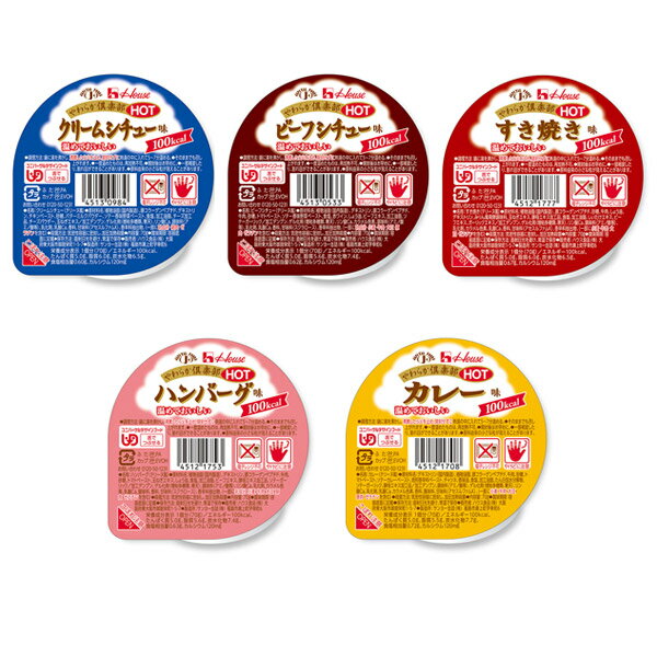 やわらか倶楽部ホット 5種セット 【舌でつぶせる】 リニューアルして1個あたり80kcal→100kcalへ!よりなめらかな食感に改良しました。 温めておいしい、テリーヌ風の洋風おかずゼリーです。 ■セット内容■ クリームシチュー味×1個 ビーフシチュー味×1個 すき焼き味×1個 ハンバーグ味 カレー味×1個セット内容 5種類(各1個)/計5個です。詳しい成分値につきましては各商品ページをご覧ください。※画像をクリックするとご覧いただけます。