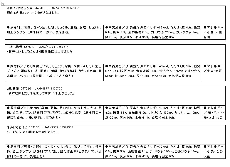 ・ご家庭では手間のかかるミキサー食を、便利に使えるレトルトパウチ食品にしました。 ・主食・主菜・副菜・箸休め・デザートの豊富な種類の組み合わせで様々なメニューをお楽しみいただけます。 ・食材の風味を大切にした、おいしいミキサー食です。 ・ご家庭の食事をミキサーにかけました。家庭では調理し難い(皮をむく、骨を取る、柔らかく煮る)素材を選びました。 ●内容/各50g 各1袋 ・豚肉のやわらか煮 ・いわし梅煮 ・だし巻卵 ・きんぴらごぼう ・大学いも ・白花豆煮  ・鯖の味噌煮 ・里芋の煮ころがし ・芋きんとん ・鶏肉のトマト煮   ・ブロッコリーのサラダ ・トマトのサラダ ・いんげんのごま和え ・大豆の煮物 ●賞味期限/製造後1年6ヶ月 ●ユニバーサルデザインフード〈区分4〉 ●生産国/日本 ●メーカー品番/ 豚肉のやわらか煮: 567600 いわし梅煮: 567610 鯖の味噌煮: 567700 鶏肉のトマト煮: 567770 だし巻卵: 567620 きんぴらごぼう: 567630 里芋の煮ころがし: 567720 いんげんのごま和え: 567800 ブロッコリーのサラダ: 567780 トマトのサラダ: 567790 大学いも: 567640 白花豆煮: 567650 芋きんとん: 567730 大豆の煮物: 567810 ●JANコード/ 豚肉のやわらか煮: 4977113567507 いわし梅煮: 4977113567514 鯖の味噌煮: 4977113677008 鶏肉のトマト煮: 4977113677701 だし巻卵: 4977113567521 きんぴらごぼう: 4977113567538 里芋の煮ころがし: 4977113677206 いんげんのごま和え: 4977113678005 ブロッコリーのサラダ: 4977113677800 トマトのサラダ: 4977113677909 大学いも: 4977113567545 白花豆煮: 4977113567552 芋きんとん: 4977113677305 大豆の煮物: 4977113678104 ●メーカー名/ホリカフーズ