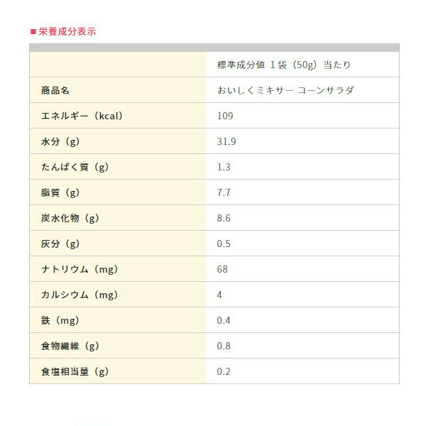 ・ご家庭では手間のかかるミキサー食を、便利に使えるレトルトパウチ食品にしました。 ・主食・主菜・副菜・箸休め・デザートの豊富な種類の組み合わせで様々なメニューをお楽しみいただけます。 ・食材の風味を大切にした、おいしいミキサー食です。 ・ご家庭の食事をミキサーにかけました。家庭では調理し難い(皮をむく、骨を取る、柔らかく煮る)素材を選びました。 ・スイートコーンにマヨネーズを加えたクリーミーなサラダです。 ●原材料/とうもろこし(遺伝子組換えでない)、マヨネーズ/調味料(アミノ酸)、香辛料抽出物、(一部に卵・大豆・りんごを含む) ●栄養成分/(1袋当たり)エネルギー109kcal、水分31.9g、たんぱく質1.3g、脂質7.7g、炭水化物8.6g、灰分0.5g、ナトリウム68mg、カルシウム4mg、鉄0.4mg、食物繊維0.8g、食塩相当量0.2g ●アレルギー/卵・大豆・りんご ●ユニバーサルデザインフード〈区分4・かまなくてよい〉 ●生産国/日本 ●メーカー品番/567535 ●JANコード/4977113675356 ●メーカー名/ホリカフーズ