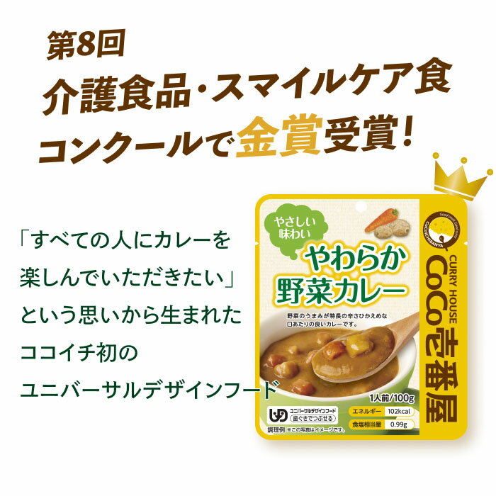 商品名 : CoCo壱番屋 レトルト カレー 介護食 区分2 歯ぐきでつぶせる CoCo壱番屋 やわらか野菜カレー 100g×10個 セット 90437 壱番屋 │ やわらか食 手軽 おかず 常温 長期間保存 簡単 調理 レンジ 高齢者 シニア カレー 辛さ控えめ とろみ ココイチ 防災 災害 非常食 お年寄り 老人