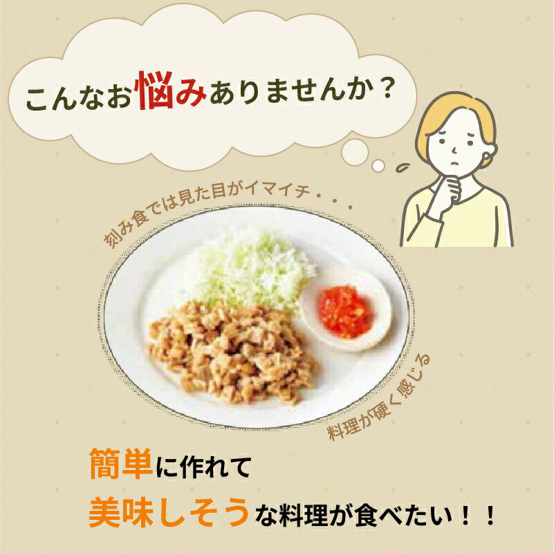 ※こちらの商品は、お届け時間の指定はできません。 ご購入時にお届け時間の指定をいただいても、お届け時間指定なしでのお手配となってしまいますので、ご了承ください。 ************************************************* 【ご注意ください】 ※冷凍でお届けします。お受け取り後は速やかに冷凍 (-18℃以下)で保存してください。 ※加熱後はお早めにお召し上がりください。 ※食事介助が必要な方は飲み込む力に個人差があるので、 飲み込むまで必ず様子を見守ってください。 ※むせた場合は直ちにご利用をおやめください。 ※召し上がる方の飲み込み状況によって適する食品や 食べ方が異なります。医師や専門家と相談の上、 それぞれにあったものをお選びください。 ************************************************* ・噛む力の弱くなった方へ、ホスピタグルメセット! ・お試し用の4種類となります ・美味しそうな見た目のまま、やわらかく噛みやすいおかず ・刻み食等の置換えとしてどうぞ ・バランスの取れた主菜1品、副菜2品の組合わせ ・レンジで温めるだけの簡単調理! ・トレーに盛り付け済み ・冷凍ストックすれば、急な食事の対応に便利! ●内容/4種類×1袋(1袋約165g) 1袋:主菜1品、副菜2品 ☆ホスピタグルメセット4種☆ 『肉じゃが』 主菜:肉じゃが 副菜:キャベツとじゃこの和え物、オクラのうま塩和え アレルギー物質/乳、小麦、牛肉、大豆、鶏肉、豚肉、ゼラチン、ごま ※本商品に使用しているしらす干しの原料魚はえび・かにが混ざる漁法で採取しています 『豚肉の生姜焼き』 主菜:豚肉の生姜焼き 副菜:ほうれん草のツナ和え、さつまいものレモン煮 [エネルギー]211kcal [たんぱく質]9.7g [脂質]10.1g [炭水化物]20.1g [食塩相当量]1.1g 『あじの南蛮漬け風』 主菜:あじの南蛮漬け 副菜:大根の肉味噌、いんげんと卵の和え物 アレルギー物質/卵、乳、小麦、大豆、鶏肉、豚肉、ゼラチン、ごま ※本商品に使用している「あじバーグ」の原料魚は、えび・かにを食べています。 『さばの味噌煮』 主菜:さばの味噌煮 副菜:キャベツと卵の和風コンソメ、 たらこのポテトサラダ アレルギー物質/卵、乳、小麦、さば、大豆、鶏肉、豚肉、りんご、ゼラチン ●調理方法/1個あたり 電子レンジ(500W):3分00秒〜4分40秒 蒸し:約20分 ※加熱時間表示は目安です。 ●賞味期限/別途商品ラベルに記載 ●保存方法/要冷凍(-18℃以下) ●生産国/日本 ●JANコード/ ホスピタグルメセット4種 肉じゃが:4902385985261 豚肉の生姜焼き:4902385985308 あじの南蛮漬け風:4902385985100 さばの味噌煮:4902385985193 ●メーカー名/日東ベスト株式会社 ケース販売(1種×10袋)もございます! ↓こちらからどうぞ↓ 噛む力がなく、飲み込みが難しい方へ お試しスムースグルメセット(ムース食)! ↓こちらからどうぞ↓************************************************* 【ご注意ください】 ※冷凍でお届けします。お受け取り後は速やかに冷凍 (-18℃以下)で保存してください。 ************************************************* ケース販売(1種×10袋)もございます! ↓こちらからどうぞ↓