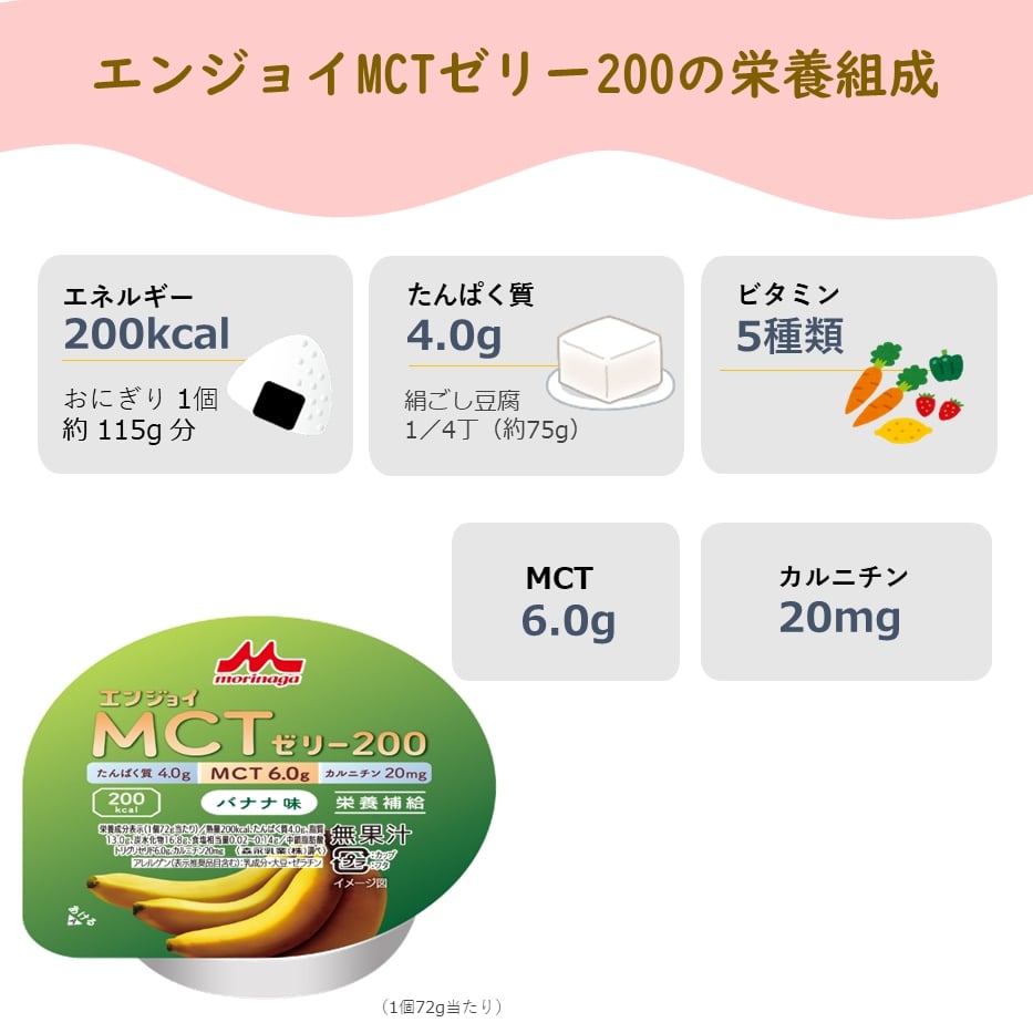 商品名 : 森永乳業 クリニコ エンジョイMCTゼリー200 バナナ味 24個 1個(72g)で200kcal(キロカロリー) 介護食 栄養補給 介護 栄養補助 栄養補助食品 高カロリー ハイカロリー ゼリーたんぱく質