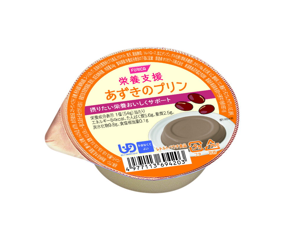品名 栄養支援あずきのプリン 内容量 54g 原材料名 牛乳(国産)、練りあん(砂糖、いんげん豆、あずき)、あずき抽出液、コラーゲンペプチド、砂糖、粉末油脂(植物油脂、コーンシロップ)、乳等を主要原料とする食品、ドロマイト、寒天、亜鉛酵母/トレハロース、加工デンプン、ゲル化剤(増粘多糖類)、カゼインNa、乳化剤、V.C、酸味料、クエン酸鉄アンモニウム、ナイアシン、V.E、香料、パントテン酸Ca、V.B1、V.B6、V.B2、V.A、葉酸、V.D、V.B12、(一部に乳成分・大豆・ゼラチンを含む) 賞味期限 製造から 12ヶ月 保存方法 常温で保存できますが、なるべく冷暗所で保存してください。 原産国 提供元・日本 配送方法 常温 特記事項 そのままでお召し上がりいただけます。 冷やしていただくとより美味しくお召し上がりいただけます。 ※温めますと形状が損なわれますので、加熱はしないでください。 開封後はお皿に移し、ラップをかけて冷蔵庫に保存し、なるべく早めにお召し上がりください。 弊社の都合で商品デザインの変更をする場合がございますので予め ご了承下さい。 栄養成分単位 1個54g当たり エネルギー 84kcal たんぱく質 5.6g 脂質 2.5g 炭水化物 9.8g 食塩相当量 0.1g ■ホリカフーズの介護食について ホリカフーズの介護食は高齢者や身体的な制約を持つ方々に美味しくお召し上がりいただくために、ミキサー食のペースト状で食材の柔らかさや消化しやすにこだわり、噛む力や嚥下機能に制限のある方々のために、食事の形状や大きさも工夫しております。 さらに、栄養バランスも重視しており、たんぱく質、ビタミン、ミネラルなど、必要な栄養素が含まれ、健康状態を維持するための食事になります。 商品についても、単品商品からセット商品まで幅広いラインナップを取り揃えており、主食、副菜、スイーツなど日々の食事のバリーエーションも増えて、介護施設・病院・お客様からお喜びいただいております。