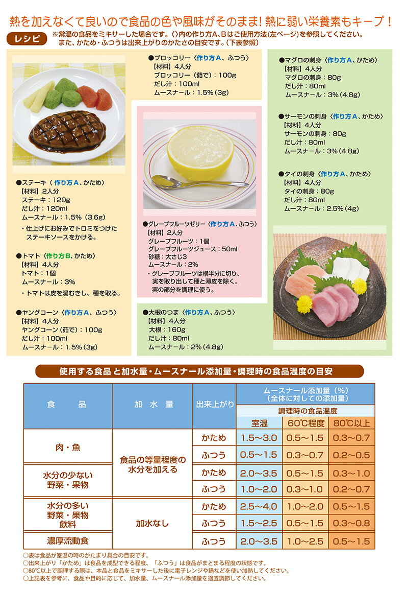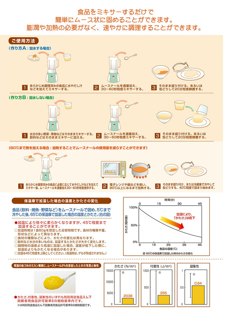 ※お取り寄せ品は入荷後の発送となりますのでお届けまで日数をいただきます。 ※2〜4営業日で入荷予定です。ムースナールは飲み込みにくい食品と共にミキサーするだけで食べやすい適度なムース状の形態を提供することができます。 【ムースナールの特徴】 ・ミキサーするだけで簡単にムース状に ・膨潤・加熱の必要が無く、速やかに調理が可能 ・熱を加えなくて良いので食品の色や風味がそのままで、栄養キープ 【原材料名】デキストリン(国内製造)、増粘多糖類、塩化カリウム、乳酸カルシウム 【形 態】粉末800g 【保存方法】高温多湿や直射日光を避け、涼しいところに保存してください。 【成分表 100gあたり】 エネルギー251kcal/たんぱく質2.0g/ 脂質 0.0g/糖質35.5g/ 食物繊維50.4g/ナトリウム450mg/ カリウム680mg/リン76mg 【使用上の注意】 ・重度に嚥下機能が低下した方は、ご使用前に医師、栄養士等にご相談ください。 ・食品の種類や調理時の温度、お召し上がる際の食品の温度によりかたさが変わります。 ・温かい食品を調理した場合、食品が冷めるとゲルの強度が高まります。 ・加水量、本品の添加量を適宜調節し、お召し上がる前に、必ずかたさを確認してください。 ・調理後はお早めにお召し上がりください。 ・ミキサーは高速回転のものをご利用ください。フードカッターや泡立て器といった回転数の低い器具では本品がうまく利用できない場合があります。 ・開封後はチャックをしっかり閉め涼しいところに保存し、お早めにご利用ください。 ・お子様または介護や介助の必要な方の手の届かないところに保存してください。 ・粉末のまま口に入れないでください。のどに詰まる原因となります。 ・万一、開封時に色、臭い、味などに異常が見られる場合は使用しないでください。 ・本品を使用することで、誤嚥を確実に防ぐことができるものではございません。