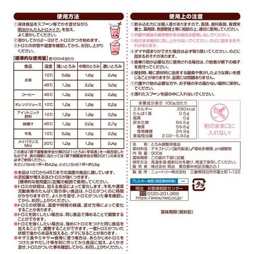 お店TOP>健康食品>特別用途食品>えん下困難者用食品>とろみ調整用食品>明治 かんたんトロメイク (900g*3袋セット)商品区分:えん下困難者用食品(特別用途食品)【明治 かんたんトロメイクの商品詳細】●いろいろな飲み物や料理にすばやく溶けて、どんな温度でもなめらかな「とろみ」がつけられます。●溶けやすく、ダマになりにくい。●加熱不要で手軽にとろみがつけられます。●クリアなとろみでおいしさそのまま。●さまざまな料理やデザートのソースにも。【召し上がり方】(1)液体食品をスプーン等でかき混ぜながら明治かんたんトロメイクを加え、よく溶かして下さい。(2)溶かしてから2〜3分で、トロミがつき始めます。(3)トロミの状態や温度を確認してから、お召し上がりください。・本品は10度から45度までの温度の食品に適しています。・添加量が増えるほどトロミが強くつきます。(標準的な使用量)に記載の範囲で使用してください。・トロミの状態は、加える食品によって変化します。牛乳や濃厚流動食等のたんぱく質の多い食品は、トロミがつくのに時間がかかりますので、よくかき混ぜ、トロミがついた事を確認してから、お召し上がりください。・トロミの状態は、温度や時間の経過、混ぜ方等によって変化することがあります。トロミを弱くしたい場合は、同じ食品で薄めることで調整することができます。・トロミを強くしたい場合は、強めにトロミをつけた同じ食品を加えることで、調整することができます。一度トロミがついた状態で後から本品を加えると、ダマになることがあります。・キザミ食やミキサー食等に使う場合は、あらかじめトロミをつけた水やだし汁等を別に作ってから食品に加え、よくかき混ぜ、トロミがついた事を確認してから、お召し上がりください。【品名・名称】とろみ調整用食品【明治 かんたんトロメイクの原材料】デキストリン(国内製造)/増粘多糖類、pH調整剤【栄養成分】100g当たりエネルギー:290kcal、たんぱく質:0.5g、脂質:0g、炭水化物:84.5g(糖質:59.6g、食物繊維:24.9g)、食塩相当量:2.02-5.93g【保存方法】・高温多湿・直射日光を避け、常温で保存してください。【注意事項】・飲み込む力には個人差がありますので、医師、歯科医師、管理栄養士、薬剤師、言語聴覚士等に相談の上、適切に使用してください。・外観や風味の異常等がある場合は使用しないでください。・粉のまま絶対に召し上がらないでください。のどに詰まるおそれがあります。・ダマや固まりができた場合は必ず取り除いてください。のどに詰まるおそれがあります。・食事介助が必要な方にご使用される場合には、介助者が嚥下の様子を見守ってください。・開封時、稀に原材料に由来する酸臭や焦がしたような臭いを感じることがありますが、品質には問題ありません。・介護や介助の必要な方や、お子様の手の届かない場所に保存してください。・濡れたスプーンを袋の中に入れないでください。【原産国】日本【ブランド】トロメイク【発売元、製造元、輸入元又は販売元】明治※説明文は単品の内容です。商品に関するお問い合わせは、下記までお願いいたします。受付時間:10:00-16:00(土日祝、メーデー、年末年始除く)おかし:0120-041-082一般食品:0120-370-369ベビー:0120-358-369栄養食品・流動食(メイバランス他):0120-201-369スポーツ(ヴァーム他)・美容・健康:0120-858-660飲料:0120-598-369リニューアルに伴い、パッケージ・内容等予告なく変更する場合がございます。予めご了承ください。(お家で簡単)・単品JAN:4902705126664明治東京都中央区京橋2-2-1 ※お問合せ番号は商品詳細参照広告文責:楽天グループ株式会社電話:050-5577-5042[介護食/ブランド:トロメイク/]