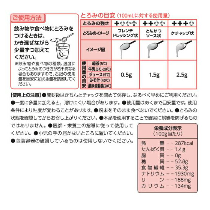 サラヤ とろみ名人マルチクイック 500gパウチ/とろみ調整食品/サラヤ/SARAYA トロミ/とろみ剤/溶けやすい/濃厚流動食/牛乳/粉末タイプ/ メーカー:サラヤ(SARAYA)※ご注文後、お取り寄せしてからの出荷となります。溶けやすく、べたつきの少ない粉末タイプのとろみ剤。濃厚流動食や牛乳にも、すばやくとろみがつきます。とろみがつくのも安定するのも速く、どんな食品にも同じ使用量で同じとろみをつけることができます。幅広い温度に対応。便利な密封チャック付。商品詳細内容量:500g原材料:マルトデキストリン、増粘剤(キサンタンガム)形状:粉末タイプ栄養成分表示(100gあたり):熱量/287kcal、タンパク質/1.4g、脂質/0g、糖質/52.8g、食物繊維/35.3g、ナトリウム/1930mg、リン/188mg、カリウム/134mg賞味期限:製造日より2年注意事項※開封後は、なるべくお早めにご使用ください。※一度に多量に加えると、溶けにくい場合があります。※使用量はあくまでも目安です。使用条件によりとろみの状態が変わることがあります。※粉末をそのまま食べないでください。※とろみの状態を確認してからお召し上がりください。※本品を使用することで確実に誤嚥を防げるものではありません。※医師・管理栄養士等の指導に従って使用してください。※直射日光、高温多湿をさけ、常温で保管してください ※商品パッケージや仕様は予告なく変更されることがあります。 2