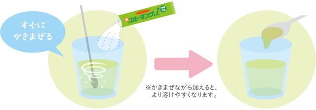 特徴 ●温かい飲み物でもダマになりにくい溶けやすさです。 ●短時間でとろみがつき始めます。 ●ベタツキが少ない原材料を配合しています。 ●食品の風味を損なわずとろみをつけられます。 ●お茶、みそ汁、牛乳等、さまざまな液状食品にとろみをつけられます。 ●さまざまな液状食品に、同じ使用量で同程度のとろみがつけられます。 使用方法 1.飲み物や液状食品に、本製品を加えて、すぐにかきまぜてください。 2.かきまぜてから短時間で安定したとろみがつきます。 3.とろみの状態や温度を確認してから召し上がってください。 ※牛乳などのとろみがつきにくい飲み物は、本製品を加えて、かきまぜてからしばらく放置した後、再度よくかきまぜてください。 ご注意 ●食事介助が必要な方にご使用される際は、確実に飲み込むまで介助者は見守ってください。 ●本製品を溶かした際にダマができた場合は、必ず取り除いてください。のどに詰まる恐れがあります。 ●とろみの状態は温度の変化、時間の経過により変化することがありますので、召し上がる前には必ず確認してください。 ●飲み込む力には個人差がありますので、必要に応じてかかりつけの専門の医師、歯科医師、管理栄養士、薬剤師、言語聴覚士等にご相談の上適切にご使用ください。