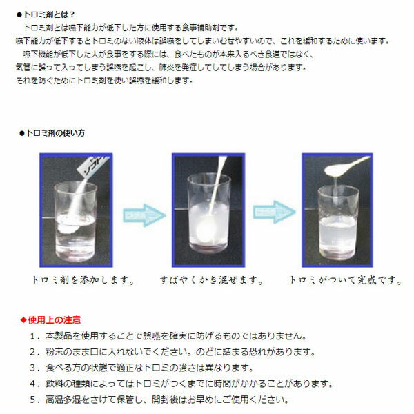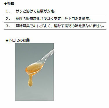 ※ケース販売です。1ケース(1kg×10袋入) ・ダマになりにくく、ややストロングなトロミに ・サッと溶け、なめらかなベタつきのないトロミにできます ・時間経過による変化が少なく粘度が安定 ・優しく溶けまとまりのあるスタンダードなトロミになります ・とろみの立ち上がりがはやく、細かく刻んだ食品をまとめるのに強みを発揮 ・少量で十分な粘度が得られます ・使用する食材の良さを引き出し、理想のトロミに仕上げます ・冷温両用でどちらのお料理にもご使用いただけます ・カロリー控えめです ○粘度の強さ お茶100mLに対しての添加量1g…とろみの強さ やや弱・練乳状 お茶100mLに対しての添加量2g…とろみの強さ やや強・はちみつ状 お茶100mLに対しての添加量3g…とろみの強さ 強・ヨーグルト状 お茶100mLに対しての添加量4g…とろみの強さ 非常に強・ジャム状 ●原材料/デキストリン、増粘多糖類、pH調整剤 ●栄養成分/(100g当たり)エネルギー253kcal、たんぱく質0.7g、脂質0g、糖質61.4g、食物繊維24.6g、ナトリウム1490mg、カルシウム10.4mg、リン51.1mg、鉄0.2mg、カリウム1650mg ●分量目安/(100mL)お茶:2.0g、スポーツ飲料:2.0g、味噌汁:1.6g ●賞味期限/製造日より2年 ●入数/1ケース(1kg×10袋入) ●JANコード/4942223251400 ●メーカー/ウエルハーモニー