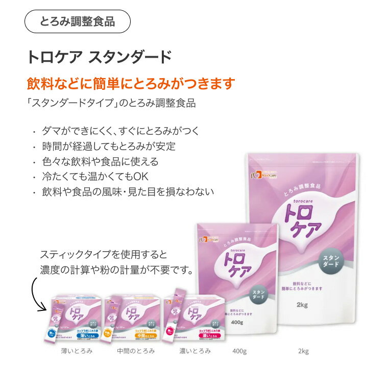 商品名 : とろみ剤 とろみ調整食品 トロケア スタンダード 400g フードケア │ 介護食 とろみ調整 小分け えん下 嚥下 日本製高齢者 誤嚥 とろみ お年寄り 老人 シニア 食事介助 スティックタイプ ダマがでにくい お茶 ジュース 牛乳 在宅介護 病院 老人ホーム デイサービス