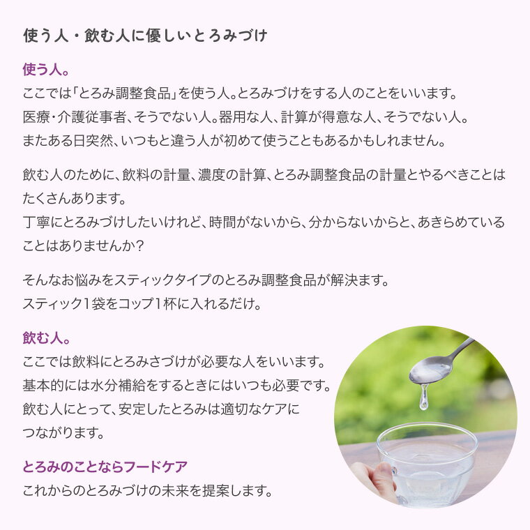 ●原材料/デキストリン(国内製造)/増粘多糖類●栄養成分/(2g当たり)エネルギー6.1kcal、たんぱく質0.01g、脂質0g、炭水化物1.8g、食塩相当量0.08g●分量目安(お茶(20℃)100mLに対して)/フレンチドレッシング状:1.0g、とんかつソース状:2.0g、ケチャップ状:3.0g●賞味期限/製造後2年●生産国/日本・飲料などに簡単にとろみがつきます。・水の場合、約30秒でとろみがつきはじめます。牛乳やみそ汁など、様々な飲料や食品にご使用いただけます。・「スタンダードタイプ」のとろみ調整食品。・ダマができにくく、すぐにとろみがつく。・色々な飲料や食品に使える。・風味・見た目を損なわない。※のどに詰まった場合は直ちに救急に連絡し、指示にしたがって応急処置をしてください。※粉のまま口に入れないでください。【フードケア】