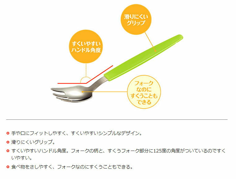 ・大きく深いフォークで自分で食べる方もこぼれにくい。 ・すくいやすいハンドル角度。 ・滑りにくいグリップ。 ・フォークなのにすくうこともできます。 ●サイズ/金属部:6.2cm、ハンドル部:10.2cm ●重さ/19g ●材質/金属部:18-8ステンレス鋼、ハンドル部:ポリプロピレン ●耐熱温度/ハンドル部:110℃ ●生産国/日本 ●煮沸消毒可/酸素系漂白不可/塩素系漂白不可 ●食洗機不可 ●乾燥機不可(85℃) ●メーカー品番/11172→11086 ●JANコード/4902508111720 ●メーカー名/ピジョン