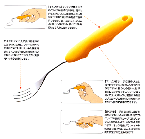 どのような持ち方にも対応、利き手も問いません。 ネックが曲がり角度を自由に変えられるので、使い手に合わせた微妙な調整も可能です。 ※注意:ネックを10回以上、90度の角度に曲げ伸ばしすると、金属疲労をおこし折れやすくなります。 食洗器対応でお手入れ簡単、煮沸消毒も可能なので清潔に使うことができます。 ■対 象:握る力の弱い人 手や指・腕の筋力が弱い人 ひじ・肩の関節に軽い運動障害のある人 スプーンやフォークを持ちにくいと感じている人 ■材 質:本体=ステンレス鋼/グリップ=エラストマ樹脂 ■カラー:イエロー ■全 長:205mm ■重 さ:約38g ■製造元:株式会社 青芳(新潟県燕市)