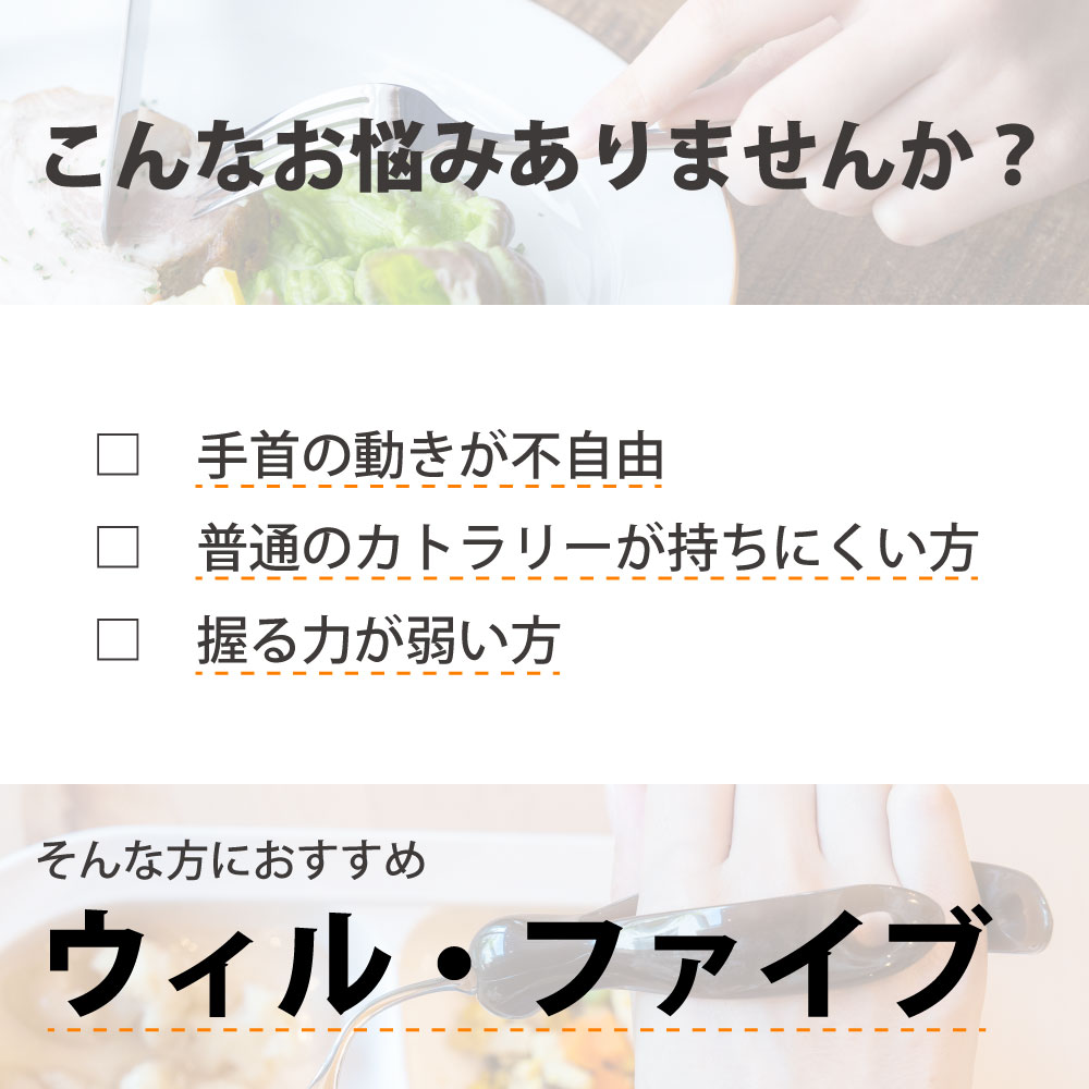 商品詳細 商品名 ウィル・ファイブ フォーク 本体サイズ L240mm スプーンヘッド部寸法 幅23×長さ25mm 素材 18-8ステンレス、形状記憶ポリマー 重量 約39g 商品説明 世界初、温度の変化によって形を変える形状記憶ポリマーを持ち手として使用した「ウィル」シリーズ。 「ウィル・ファイブ」は、手の動きや姿勢、食べ物を口に運ぶまでの導線に合わせて、ヘッドと持ち手を繋ぐネック部分と持ち手の角度を変えることができます。 ネックを左右にひねる、上下前後に曲げることができるため、その人その人に身体や運動能力に合わせ調節ができる、使う方に寄り添ったカトラリーです。 ネックは特殊ステンレス材を採用しているため、利き手に関係なく最も食べやすい角度にヘッドの位置を決めることができます。 曲げる時はネックに両手の指を添え、ゆっくりと静かに曲げてください。角度を元に戻す作業も同じです。 持ち手は「ウィル・ワン」シリーズ同様、形状記憶ポリマーを使用し、手の状態に合わせた形を作ることができます。 手や指の変形、痛み、握力の低下などで握る力が弱い人、握る力がない人、手首、ひじ、肩の関節に運動障害がる人にも安心してお使いいただけます。 ※電子レンジ使用不可、つけ置き洗いはご遠慮ください。※ネックを一度に10回以上大きく曲げると折れやすくなりますのでお気をつけください。 備考 ※モニターの発色具合により、実物と色が異なる場合がございます。※記載のサイズ重量は目安です。実際の商品と異なる場合もございます。 ※この商品は弊社他店舗でも販売しております。在庫数の更新は随時行っておりますが、 お買い上げいただいた商品が、品切れになってしまうこともございます。 その場合、お客様には必ず連絡をいたしますが、万が一入荷予定がない場合は、 キャンセルさせていただく場合もございますことをあらかじめご了承ください。 【キーワード】持ち手の形もネックの角度も自分に合った形に変えられるフォーク!握力の弱い人、手首が不自由な人にも安心してお使いいただけます。青芳 公式 Willassist ウィルアシスト 介護用品 介助用品 自助具 食事補助 麻痺 マヒ 握力低下 筋力低下 リウマチ リハビリ 療育 手首 不自由 握力が弱い サポート 施設 病院 贈り物 プレゼント 敬老の日 両親 父の日 母の日ネコポス発送1本まで ウィル・ファイブ スプーン はこちら ウィル・ファイブ ユニバーサルスプーンはこちら その他注意事項 ・メール便はネコポス(ヤマト運輸)でお届けします。宅配便と同様のお届け日でポストに配達します。※一部地域をのぞく ・ポストへのお届けのため、「代金引換決済の選択」「お届け日の指定」はできません。 ・メール便発送は1本までとなります。配送方法がメール便で2本以上ご注文の場合、メール便複数件または宅配便でのお届けとなります。※宅配便は送料無料ラインを超えない場合、追加送料がかかります。 ・本商品と他商品を合わせてご注文いただいた場合、宅配便での発送となる場合がございます。商品合計金額が送料無料ラインに達しない場合配送料がかかります。