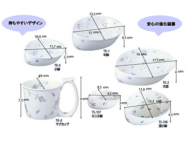 ・おいしい食事と自立をサポート。使う人への思いやりを盛った器。 ・持ちやすさを重視したデザイン。滑り落ちても安心の強度のある強化磁器。 ●サイズ/幅15cm×奥行13.5cm×高さ4.5cm ●重さ/280g ●材質/強化磁器 ●生産国/日本 ●食洗機可 ●乾燥機可 ●電子レンジ可 ●メーカー品番/TK-1 ●メーカー名/東海興商