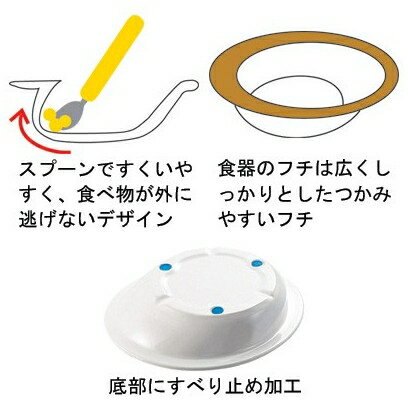 ・持ちやすく進化した自助食器シリーズ。滑り止め効果がアップ!!・スプーンですくいやすく、食べ物が外に逃げないデザインです。・食器のフチは広くしっかりとしたつかみやすいフチです。・食器底部のすべり止め加工が新しくなりました。食器をすべりにくく、安定させます。●サイズ/幅12.8×奥行12×底深さ4.1cm●重さ/100g●材質/メラミン樹脂、裏面:シリコンゴム●生産国/日本●塩素消毒不可、食洗機可、乾燥機可、電子レンジ不可