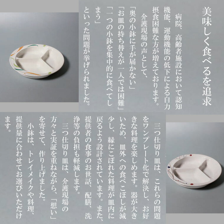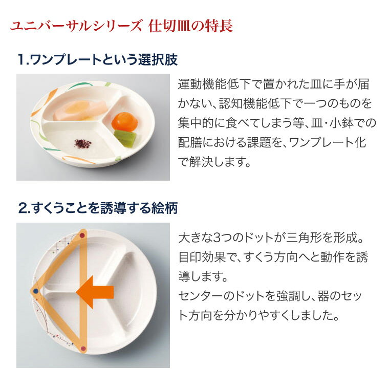 ●サイズ/直径20×高さ4cm●重さ/270g●材質/メラミン樹脂、シリコン●生産国/日本●食洗機可●乾燥機可●電子レンジ不可●酸素系漂白不可●塩素系漂白不可・「返し」付きの仕切皿で、よりすくいやすくより食べやすく。・介護施設との共同開発で生まれた新しい仕切皿。・側面に返しがついていて、すくう動作がスムーズです。・食器底面にすべり止め付きで食器が動きません。【三信化工】