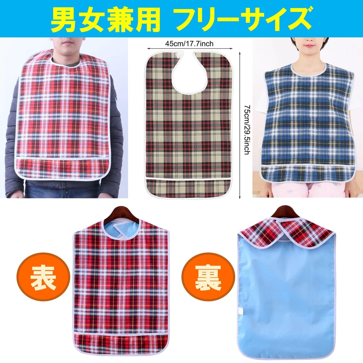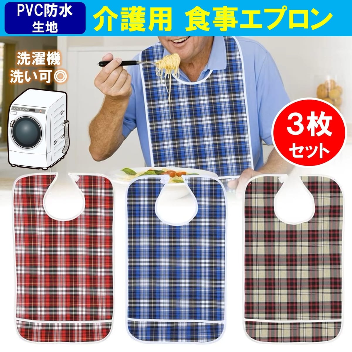 食べこぼしや汚れを気にせずに、気兼ねなく食事を明るく楽しむための食事用エプロン3枚セットです。可愛らしく華やかなチェック柄エプロンが、いつもの食卓を明るく華やかに彩ります。材質はPVC防水生地を使用しておりますので、汁物をこぼしてもエプロンがしっかりと保護します。食事用エプロンはすぐに汚れてしまいますが、洗濯機で丸洗いすることができますので毎日のお手入れも手間が掛かりません(ネット洗い推奨)。また、シワになりにくく、乾きやすい素材ですのでお手入れ管理も効率的です。食事エプロンのカラーは、ブルー、レッド、ブラウン3色のセットとなります。サイズは横幅45×高さ75cm男女兼用フリーサイズです。エプロンの表面はPVCに綿生地をあしらいファッション性を高めています。介護用エプロンの留め具は、ご高齢の方にも脱着しやすいマジックテープ留めです。ワンタッチで脱着可能ですので、ストレスなくご着用いただけます(個人差はあります)。エプロン下部には食べこぼしをキャッチする深さ10cmの大きな受け口ポケットが装備されています。この食事用エプロンは、ご高齢の方の介護用エプロンとしてご愛用いただいております。一般的な水色や白色のエプロンと比べて、チェック柄の可愛らしいファッショナブルなデザインは食事の場を明るく楽しく演出し、気分を高めてくれるので大変喜ばれます。商品詳細: 防水食事用エプロン(介護用エプロン)3枚セット 【カラー】 ブルー・レッド・ブラウン 【材質】 PVC防水生地・綿 【重量】 約150g/枚 【SIZE】 45×75cm 【お手入れ】 洗濯機洗い可(ネット洗い推奨)※モニターの環境等により、色の見え方に若干差が生じる場合がございます。予めご了承ください。 食べこぼしや汚れを気にせずに、気兼ねなく食事を明るく楽しむための食事用エプロン3枚セットです。可愛らしく華やかなチェック柄エプロンが、いつもの食卓を明るく華やかに彩ります。材質はPVC防水生地を使用しておりますので、汁物をこぼしてもエプロンがしっかりと保護します。食事用エプロンはすぐに汚れてしまいますが、洗濯機で丸洗いすることができますので毎日のお手入れも手間が掛かりません(ネット洗い推奨)。また、シワになりにくく、乾きやすい素材ですのでお手入れ管理も効率的です。食事エプロンのカラーは、ブルー、レッド、ブラウン3色のセットとなります。サイズは横幅45×高さ75cm男女兼用フリーサイズです。エプロンの表面はPVCに綿生地をあしらいファッション性を高めています。介護用エプロンの留め具は、ご高齢の方にも脱着しやすいマジックテープ留めです。ワンタッチで脱着可能ですので、ストレスなくご着用いただけます(個人差はあります)。エプロン下部には食べこぼしをキャッチする深さ10cmの大きな受け口ポケットが装備されています。この食事用エプロンは、ご高齢の方の介護用エプロンとしてご愛用いただいております。一般的な水色や白色のエプロンと比べて、チェック柄の可愛らしいファッショナブルなデザインは食事の場を明るく楽しく演出し、気分を高めてくれるので大変喜ばれます。商品詳細: 防水食事用エプロン(介護用エプロン)3枚セット 【カラー】 ブルー・レッド・ブラウン 【材質】 PVC防水生地・綿 【重量】 約150g/枚 【SIZE】 45×75cm【お手入れ】 洗濯機洗い可(ネット洗い推奨) ※モニターの環境等により、色の見え方に若干差が生じる場合がございます。予めご了承ください。