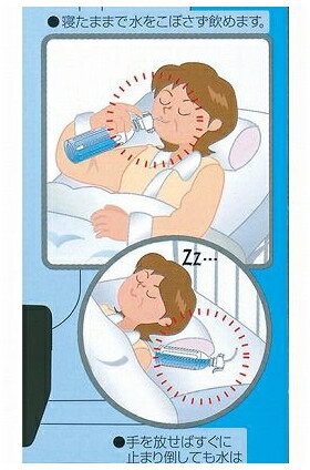 ・倒してもこぼれない。寝たままワンタッチで飲める介護容器。・片手で簡単に使える。・掃除も簡単で抗菌素材を使用しているので安心。・寝たままで水をこぼさず飲めます。・手を放せばすぐに止まり、倒しても水はこぼれません。・決してこぼれない安心容器。・本人の意思がない時には止まるようにし、片手でワンタッチで飲める。・寝たままでも面倒な蓋の開閉がなく、量が少なくなっても最後まで飲料できる。・掃除も簡単で抗菌素材使用しているので安心。●サイズ/長さ28.5cm(伸ばした状態)●適応ペットボトルサイズ/350〜500mL●重さ/30g●材質/上部・下部ストロー・逆止バルブ・パッキン:シリコン、キャップ・継手・円錐・その他:PP●耐熱温度/5℃〜45℃●生産国/日本●煮沸消毒可/酸素系漂白不可/塩素系漂白不可●食洗機不可、乾燥機不可、電子レンジ不可●抗菌加工ハジーストロー