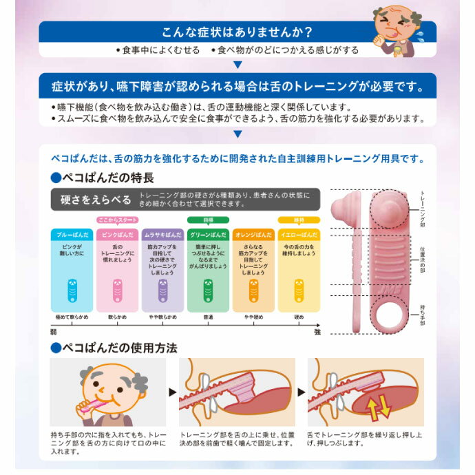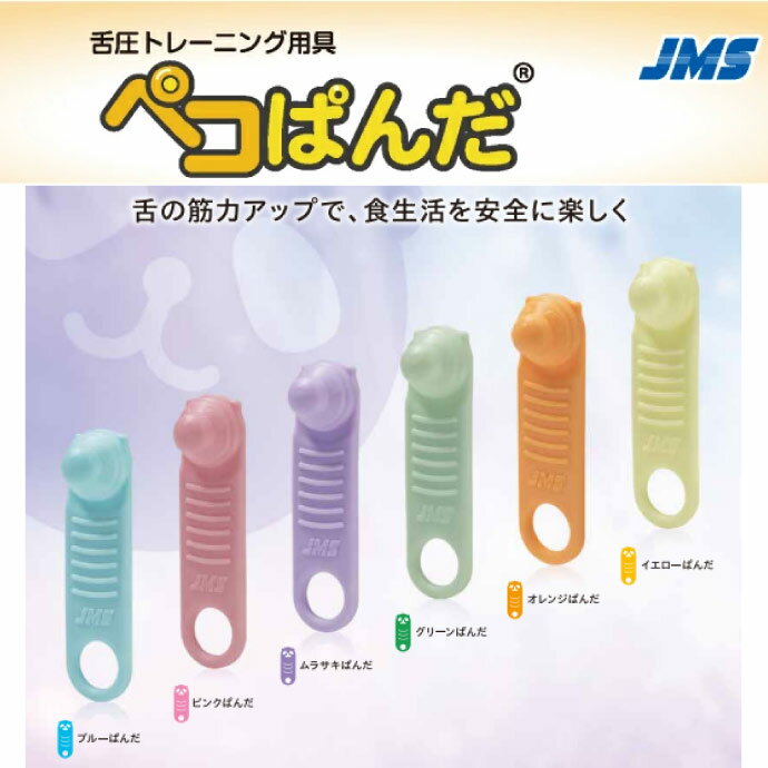 「いつまでもおいしく、楽しく、安全な食生活を送るために」 食事中によくむせたり、食べ物がのどにつかえる感じが するなどの症状はありますか? そのような症状の方は嚥下障害を疑ってみましょう。 舌の運動機能は摂食・嚥下機能と深く関係しており、安全に食事をする上で重要な機能です。 スムーズに食べ物を飲み込めるよう嚥下機能向上のため、舌の筋力を強化しましょう。 ペコぱんだとは? ペコぱんだは嚥下(飲み込み)に必要な舌と口蓋の接触力(舌圧)を強化するために開発された 自主訓練用トレーニング用具です。 ●かたさの選び方の目安 硬さ 色 選び方の目安 極めて軟らかめ ブルー ピンクが難しい方に 軟らかめ ピンク ここからスタート!! やや軟らかめ バイオレット 筋力アップを目指して 普通 グリーン 目標の硬さ やや硬め オレンジ さらなる筋力アップに 硬め イエロー 筋力の維持に 品名ペコぱんだ 用途舌トレーニング用具 重量約9g 材質スチレン系熱可塑性エラストマー カラー 極めて軟らかめ(SS) : ブルー 軟らかめ(S) : ピンク やや軟らかめ(MS) : バイオレット 普通(M) : グリーン やや硬め(MH):オレンジ 硬め(H) : イエロー 【舌圧レベル表示器 ペコじーな 本体セットはこちら】 【ご注意(免責)事項】当店では、サイト上に最新の商品情報を掲載するよう努めておりますが、メーカーの都合等により、商品規格や仕様(容量・成分・パッケージ・原産国など)が予告なく変更される場合がございます。このため、実際にお届けする商品と商品ページ上の情報表記が異なる場合がございますので、ご使用前には必ずお届けした商品の商品ラベルや注意書きをご確認ください。また、商品情報についてページ表記以外の詳細が必要な場合は、メーカー等にお問合せください。