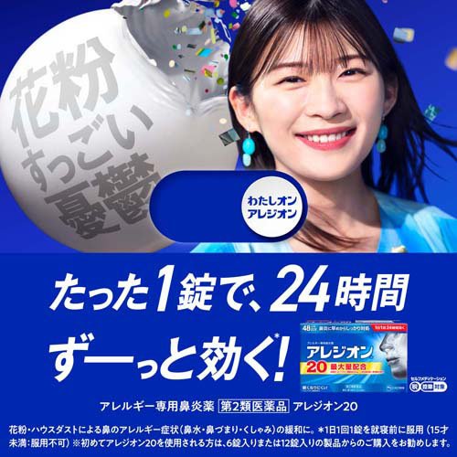 お店TOP>医薬品>鼻炎薬・耳の薬>鼻水・鼻づまり>鼻炎薬 錠剤>アレジオン20 (48錠) (48錠*3箱セット(セルフメディケーション税制対象))お一人様1セットまで。医薬品に関する注意文言【医薬品の使用期限】使用期限120日以上の商品を販売しております商品区分:第二類医薬品【アレジオン20 (48錠)の商品詳細】●エピナスチン塩酸塩製剤●アレジオン20は、第2世代抗ヒスタミン成分のエピナスチン塩酸塩を1錠あたり20mg含有。くしゃみ・鼻汁症状にすぐれた効果を発揮します。第2世代抗ヒスタミン成分なので、眠くなりにくいアレルギー性鼻炎内服薬です。●花粉やハウスダストによる鼻炎症状は、それらを吸い込んだ時にヒスタミンやロイコトリエンといった原因物質が体内で放出されることで起こります。エピナスチン塩酸塩は、原因物質の作用を阻害するとともに、放出自体を抑えることでアレルギーによる鼻炎症状にすぐれた効果を発揮します。●1日1回就寝前の服用で効きます。なお、花粉などの季節性のアレルギー性鼻炎症状に使用する場合は、症状が出始めたら早めに服用すると効果的です。【効能 効果】花粉、ハウスダスト(室内塵)などによる次のような鼻のアレルギー症状の緩和:鼻みず、鼻づまり、くしゃみ【用法 用量】次の1回量を1日1回、就寝前に水又はぬるま湯で服用してください。[年齢:1回量]成人(15才以上):1錠15才未満:服用しないこと★用法・用量に関連する注意(1)用法・用量を厳守してください。(2)花粉などの季節性のアレルギー性鼻炎症状に使用する場合は、花粉飛散予測日から、又は、症状が出始めたら早めに服用を始めると効果的です。(3)錠剤の取り出し方錠剤の入っているPTPシートの凸部を指先で強く押して裏面のアルミ箔を破り、取り出してお飲みください。(誤ってそのまま飲み込んだりすると食道粘膜に突き刺さるなど思わぬ事故につながります。)【成分】1錠(1日量)中成分:分量エピナスチン塩酸塩:20mg添加物:無水ケイ酸、乳糖、ヒプロメロース、ポビドン、アクリル酸エチル・メタクリル酸メチルコポリマー、マクロゴール、シリコーン樹脂、ステアリン酸Mg、タルク、酸化チタン、トウモロコシデンプン【注意事項】★してはいけないこと(守らないと現在の症状が悪化したり、副作用・事故が起こりやすくなります。)1.次の人は服用しないでください(1)本剤又は本剤の成分によりアレルギー症状を起こしたことがある人。(2)15才未満の小児。(3)次の診断を受けた人。肝臓病2.本剤を服用している間は、次のいずれの医薬品も使用しないでください他のアレルギー用薬(皮膚疾患用薬、鼻炎用内服薬を含む)、抗ヒスタミン剤を含有する内服薬等(かぜ薬、鎮咳去痰薬、乗物酔い薬、催眠鎮静薬等)3.服用後、乗物又は機械類の運転操作をしないでください(眠気等があらわれることがあります。)4.授乳中の人は本剤を服用しないか、本剤を服用する場合は授乳を避けてください5.服用前後は飲酒しないでください★相談すること1.次の人は服用前に医師、薬剤師又は登録販売者に相談してください(1)医師の治療を受けている人。(2)妊婦又は妊娠していると思われる人。(3)高齢者。(4)薬などによりアレルギー症状を起こしたことがある人。(5)アレルギーによる症状か他の原因による症状かはっきりしない人。(6)気管支ぜんそく、アトピー性皮膚炎等の他のアレルギー疾患の診断を受けたことがある人。(7)エピナスチン塩酸塩を10mg含有する医薬品から本剤に変更しようとしている人。2.服用後、次の症状があらわれた場合は副作用の可能性があるので、直ちに服用を中止し、添付文書を持って医師、薬剤師又は登録販売者に相談してください[関係部位:症状]皮膚:発疹・発赤、はれ、かゆみ消化器:吐き気・嘔吐、口内炎、胃部不快感、腹痛、胃重感、胃もたれ感、腹部膨満感、食欲不振精神神経系:めまい、不眠、頭痛、頭がボーッとする、しびれ感、悪夢、幻覚、幻聴呼吸器:息苦しい循環器:動悸泌尿器:排尿困難、頻尿、血尿、蛋白尿その他:むくみ、ほてり、胸痛、痰がからむ、倦怠感、鼻づまり、月経異常、苦味を感じる、味覚が弱くなる、女性化乳房(男性に見られる女性のような乳房)、乳房が大きくなるまれに下記の重篤な症状が起こることがあります。その場合は直ちに医師の診療を受けてください。[症状の名称:症状]肝機能障害:発熱、かゆみ、発疹、黄疸(皮膚や白目が黄色くなる)、褐色尿、全身のだるさ、食欲不振等があらわれる。血小板減少:血液中の成分である血小板の数が減ることにより、鼻血、歯ぐきからの出血、青あざ等の出血症状があらわれる。3.服用後、次の症状があらわれることがあるので、このような症状の持続又は増強が見られた場合には、服用を中止し、添付文書を持って医師、薬剤師又は登録販売者に相談してください口のかわき、便秘、下痢、眠気4.1週間位服用(他のエピナスチン塩酸塩を含有する医薬品の服用期間を含む)しても症状がよくならない場合は服用を中止し、添付文書