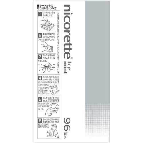お店TOP>医薬品>動悸・息切れ・禁煙>禁煙>禁煙(医薬品) 禁煙ガム>ニコレット アイスミント (96コ入(セルフメディケーション税制対象))お一人様3個まで。医薬品に関する注意文言この医薬品は指定第2類医薬品です。小児、高齢者他、禁忌事項に該当する場合は、重篤な副作用が発生する恐れがあります。詳しくは、薬剤師または登録販売者までご相談ください。【医薬品の使用期限】使用期限120日以上の商品を販売しております商品区分:指定第二類医薬品【ニコレット アイスミントの商品詳細】●ニコレットアイスミントはタバコをやめたいと望む人のための医薬品で、禁煙時のイライラ・集中困難などの症状を緩和します。(タバコをきらいにさせる作用はありません)●使用期間は3ヵ月をめどとし、使用量を徐々に減らすことで、あなたを無理のない禁煙へ導きます。●タバコを吸わない人や現在吸っていない人は、身体に好ましくない作用を及ぼしますので使用しないでください。●シュガーレスコーティングで、かみやすいニコチンガム製剤です。【効能 効果】禁煙時のイライラ・集中困難・落ち着かないなどの症状の緩和【用法 用量】タバコを吸いたいと思ったとき、1回1個をゆっくりと間をおきながら、30〜60分間かけてかむ。1日の使用個数は下記を目安とし、通常、1日4〜12個から始めて適宜増減するが、1日の総使用個数は24個を超えないこと。禁煙になれてきたら(1ヵ月前後)、1週間ごとに1日の使用個数を1〜2個ずつ減らし、1日の使用個数が1〜2個となった段階で使用をやめる。なお、使用期間は3ヵ月をめどとする。[1回量:1日最大使用個数:使用開始時の1日の使用個数の目安(禁煙前の1日の喫煙本数):使用開始時の1日の使用個数の目安(1日の使用個数)]1個:24個:20本以下:4〜6個1個:24個:21〜30本:6〜9個1個:24個:31本以上:9〜12個【成分】1個中、次の成分を含有する。ニコチン:2mg添加物:イオン交換樹脂、キシリトール、アセスルファムカリウム、炭酸水素ナトリウム、炭酸ナトリウム、酸化マグネシウム、タルク、ハッカ油、l-メントール、炭酸カルシウム、ジブチルヒドロキシトルエン、アラビアゴム末、ヒプロメロース、酸化チタン、カルナウバロウ、ポリソルベート80、スクラロース、香料、その他9成分【注意事項】★してはいけないこと(守らないと現在の症状が悪化したり、副作用が起こりやすくなる)1.次の人は使用しないこと(1)非喫煙者〔タバコを吸ったことのない人及び現在タバコを吸っていない人〕(吐き気、めまい、腹痛などの症状があらわれることがある。)(2)すでに他のニコチン製剤を使用している人(3)妊婦又は妊娠していると思われる人(4)重い心臓病を有する人1)3ヵ月以内に心筋梗塞の発作を起こした人2)重い狭心症と医師に診断された人3)重い不整脈と医師に診断された人(5)急性期脳血管障害(脳梗塞、脳出血等)と医師に診断された人(6)うつ病と医師に診断された人(7)本剤又は本剤の成分によりアレルギー症状(発疹・発赤、かゆみ、浮腫等)を起こしたことがある人(8)あごの関節に障害がある人2.授乳中の人は本剤を使用しないか、本剤を使用する場合は授乳を避けること(母乳中に移行し、乳児の脈が速まることが考えられる。)3.本剤を使用中あるいは使用直後に次のことをしないこと(1)喫煙(2)ニコチンパッチ製剤の使用4.6ヵ月を超えて使用しないこと★相談すること1.次の人は使用前に医師、歯科医師、薬剤師又は登録販売者に相談すること(1)医師又は歯科医師の治療を受けている人(2)他の薬を使用している人(他の薬の作用に影響を与えることがある。)(3)高齢者及び20歳未満の人(4)薬などによりアレルギー症状を起こしたことがある人(5)次の症状のある人腹痛、胸痛、口内炎、のどの痛み・のどのはれ(6)次の診断を受けた人心臓疾患(心筋梗塞、狭心症、不整脈)、脳血管障害(脳梗塞、脳出血等)、バージャー病(末梢血管障害)、高血圧、甲状腺機能障害、褐色細胞腫又はパラガングリオーマ、糖尿病(インスリン製剤を使用している人)、咽頭炎、食道炎、胃・十二指腸潰瘍、肝臓病、腎臓病(症状を悪化させたり、現在使用中の薬の作用に影響を与えることがある。)、てんかん2.使用後、次の症状があらわれた場合は副作用の可能性があるので、直ちに使用を中止し、添付文書を持って医師、薬剤師又は登録販売者に相談すること[関係部位:症状]口・のど:口内炎、のどの痛み消化器:吐き気・嘔吐、腹部不快感、胸やけ、食欲不振、下痢皮膚:発疹・発赤、かゆみ精神神経系:頭痛、めまい、思考減退、眠気循環器:動悸その他:胸部不快感、胸部刺激感、顔面潮紅、顔面浮腫、気分不良3.使用後、次のような症状があらわれることがあるので、このような症状の持続又は増強が見られた場合には、使用を中止し、添付文書を持って医師、歯科医師、薬剤師又は登録販売者に相談すること(1)口内・のどの刺激感、舌の荒れ、味の異常感、唾液増加、歯肉炎(2)あごの痛み(3)しゃっくり、げっぷ4.誤って定められた用量を超えて使用し