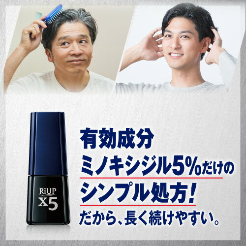 お店TOP>リアップX5 ( 60ml×3本セット)お一人様1セットまで。医薬品に関する注意文言第1類医薬品は、薬剤師が販売し、年齢、他の医薬品の使用状況等について、薬剤師が確認をさせていただき適正に使用されると認められる場合のみ販売をいたします。【医薬品の使用期限】使用期限120日以上の商品を販売しております商品区分:第一類医薬品【リアップX5の商品詳細】●リアップX5は、有効成分ミノキシジルを5%配合した男性用の発毛剤です。1日2回、1回1mLを継続して使用することで優れた発毛効果を発揮します。●キャップを開け、頭皮に押しあてるだけで、1回量の1mLを計量できる容器です。●髪が成長するには時間がかかります。発毛の効果を実感するまで、少なくとも4ヵ月間、用法・用量を守って正しくお使いください。また、その後は脱毛の進行予防の効果(既に始まってしまった脱毛がそれ以上進行するのを防ぐ効果)を維持するためにも、継続してご使用になることをおすすめいたします。【効能 効果】壮年性脱毛症における発毛、育毛及び脱毛(抜け毛)の進行予防。【用法 用量】成人男性(20歳以上)が、1日2回、1回1mLを脱毛している頭皮に塗布してください。・1回1mLのご使用は、脱毛範囲の大小に関係なくお守りください。1mLは塗り広げれば、頭皮全体に十分に行きわたる量として設計してあります。なお、容器は1mLを計量できるタイプです。【成分】100mL中成分:分量ミノキシジル:5.0g添加物:1.3-ブチレングリコール、ジブチルヒドロキシトルエン、リン酸、エタノール【注意事項】★してはいけないこと守らないと現在の症状が悪化したり、副作用が起こる可能性があります。1.次の人は使用しないでください。(1)本剤又は本剤の成分によりアレルギー症状を起こしたことがある人。(2)女性。本剤は日本人女性における安全性が確認されていないため、女性の方はミノキシジルを1%配合したリジェンヌブランドの製品をご使用ください。(3)未成年者(20歳未満)。国内での使用経験がありません。(4)壮年性脱毛症以外の脱毛症(例えば、円形脱毛症、甲状腺疾患による脱毛等)の人、あるいは原因のわからない脱毛症の人。本剤は壮年性脱毛症でのみ有効です。(5)脱毛が急激であったり、髪が斑状に抜けている人。壮年性脱毛症以外の脱毛症である可能性が高い。2.次の部位には使用しないでください。(1)本剤は頭皮にのみ使用し、内服しないでください。血圧が下がる等のおそれがあります。(2)きず、湿疹あるいは炎症(発赤)等がある頭皮。きず等を悪化させることがあります。3.本剤を使用する場合は、他の育毛剤及び外用剤(軟膏、液剤等)の頭皮への使用は、さけてください。また、これらを使用する場合は本剤の使用を中止してください。これらの薬剤は本剤の吸収に影響を及ぼす可能性があります。★相談すること1.次の人は使用前に医師又は薬剤師に相談してください。(1)今までに薬や化粧品などによりアレルギー症状(例えば、発疹・発赤、かゆみ、かぶれ等)を起こしたことがある人。(2)高血圧の人、低血圧の人。本剤は血圧に影響を及ぼす可能性が考えられます。(3)心臓又は腎臓に障害のある人。本剤は心臓や腎臓に影響を及ぼす可能性が考えられます。(4)むくみのある人。むくみを増強させる可能性が考えられます。(5)家族、兄弟姉妹に壮年性脱毛症の人がいない人。壮年性脱毛症の発症には遺伝的要因が大きいと考えられます。(6)高齢者(65歳以上)。一般に高齢者では好ましくない症状が発現しやすくなります。(7)次の診断を受けている人。甲状腺機能障害(甲状腺機能低下症、甲状腺機能亢進症)。甲状腺疾患による脱毛の可能性があります。2.使用後、次の症状があらわれた場合は副作用の可能性があるので、直ちに使用を中止し、添付文書を持って医師又は薬剤師に相談してください。[関係部位:症状]皮膚:頭皮の発疹・発赤*、かゆみ、かぶれ、ふけ、使用部位の熱感等精神神経系:頭痛、気が遠くなる、めまい循環器:胸の痛み、心拍が速くなる代謝系:原因のわからない急激な体重増加、手足のむくみ*:頭皮以外にあらわれることもあります。3.6ヵ月間使用して、次のいずれにおいても改善が認められない場合は、使用を中止し、添付文書を持って医師又は薬剤師に相談してください。脱毛状態の程度、生毛・軟毛の発生、硬毛の発生、抜け毛の程度。(太い毛だけでなく細く短い抜け毛の減少も改善の目安となります。)壮年性脱毛症以外の脱毛症であったり、脱毛が他の原因によるものである可能性があります。4.使用開始後6ヵ月以内であっても、脱毛状態の悪化や、次のような脱毛が見られた場合は、使用を中止し、添付文書を持って医師又は薬剤師に相談してください。頭髪以外の脱毛、斑状の脱毛、急激な脱毛など。壮年性脱毛症以外の脱毛症であったり、脱毛が他の原因によるものである可能性があります。その他の注意1.毛髪が成長するには時間がかかります。効果がわかるようになるまで少なくとも4ヵ月間、