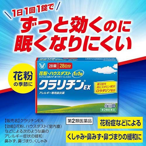 お店TOP>医薬品>鼻炎薬・耳の薬>鼻水・鼻づまり>鼻炎薬 錠剤>クラリチンEX (28錠*2箱セット(セルフメディケーション税制対象))お一人様1セットまで。医薬品に関する注意文言【医薬品の使用期限】使用期限120日以上の商品を販売しております商品区分:第二類医薬品【クラリチンEXの商品詳細】●クラリチンEXは、第2世代抗ヒスタミン成分ロラタジンを含有するアレルギー専用鼻炎薬です。●眠くなりにくく、「集中力、判断力、作業効率の低下」を起こしにくいお薬です。●1日1回1錠の服用で、鼻みず・鼻づまり・くしゃみの症状に、効き目が長く続きます。【効能 効果】花粉、ハウスダスト(室内塵)などによる次のような鼻のアレルギー症状の緩和:鼻水、鼻づまり、くしゃみ【用法 用量】成人(15才以上)、1回1錠、1日1回食後に服用してください。なお、毎回同じ時間帯に服用してください。15歳未満:服用しないこと★用法・用量に関連する注意(1)定められた用法・用量を厳守してください。(2)花粉など季節性のアレルギー性鼻炎による症状に使用する場合は、花粉飛散期に入って症状が出始めたら、症状の軽い早めの時期からの服用が効果的です。(3)1週間位服用しても症状の改善がみられない場合には、医師、薬剤師又は登録販売者に相談してください。また、症状の改善がみられても2週間を超えて服用する場合は、医師、薬剤師又は登録販売者に相談してください。(4)錠剤の取り出し方錠剤の入っているシートの凸部を指先で強く押して裏面のアルミ箔を破り、錠剤を取り出して服用してください。(誤ってシートのまま飲み込んだりすると食道粘膜に突き刺さる等思わぬ事故につながります)【成分】1錠中ロラタジン10mg添加物:乳糖、トウモロコシデンプン、ステアリン酸Mg【注意事項】★使用上の注意・してはいけないこと(守らないと現在の症状が悪化したり、副作用・事故が起こりやすくなります)1.次の人は服用しないでください(1)本剤又は本剤の成分によりアレルギー症状を起こしたことがある人。(2)15才未満の小児。2.本剤を服用している間は、次のいずれの医薬品も使用しないでください。他のアレルギー用薬(皮膚疾患用薬、鼻炎用内服薬を含む)、抗ヒスタミン剤を含有する内服薬等(かぜ薬、鎮咳去痰薬、乗物酔い薬、催眠鎮静薬等)、エリスロマイシン、シメチジン3.服用前後は飲酒しないでください4.授乳中の人は本剤を服用しないか、本剤を服用する場合は授乳を避けてください・相談すること1.次の人は服用前に医師、薬剤師又は登録販売者に相談してください(1)医師の治療を受けている人。(2)次の診断を受けた人。肝臓病、腎臓病、てんかん(3)アレルギー性鼻炎か、かぜなど他の原因によるものかわからない人。(4)気管支ぜんそく、アトピー性皮膚炎などの他のアレルギー疾患の診断を受けたことがある人。(5)妊婦又は妊娠していると思われる人。(6)高齢者。(7)薬などによりアレルギー症状を起こしたことがある人。2.服用後、次の症状があらわれた場合は副作用の可能性があるので、直ちに服用を中止し、この説明書を持って医師、薬剤師又は登録販売者に相談してください[関係部位:症状]皮膚:発疹、かゆみ、じんましん、皮膚が赤くなる、脱毛呼吸器:のどの痛み、鼻の乾燥感消化器:吐き気、嘔吐、腹痛、口唇の乾燥、口内炎、胃炎精神神経系:倦怠感、めまい、頭痛循環器:動悸、頻脈その他:眼球の乾燥、耳なり、難聴、ほてり、浮腫(顔・手足)、味覚異常、月経不順、胸部不快感、不正子宮出血、胸痛、尿閉まれに下記の重篤な症状が起こることがあります。その場合は直ちに医師の診療を受けてください。[症状の名称:症状]ショック(アナフィラキシー):服用後すぐに、皮膚のかゆみ、じんましん、声のかすれ、くしゃみ、のどのかゆみ、息苦しさ、動悸、意識の混濁などがあらわれる。てんかん:(てんかん発作既往歴のある人) 筋肉の突っ張りや震え、意識障害、発作前の記憶がない。けいれん:筋肉の発作的な収縮があらわれる。肝機能障害:発熱、かゆみ、発疹、黄疸(皮膚や白目が黄色くなる)、褐色尿、全身のだるさ、食欲不振などがあらわれる。3.服用後、次の症状があらわれることがあるので、このような症状の持続又は増強がみられた場合には、服用を中止し、医師、薬剤師又は登録販売者に相談してください口のかわき、便秘、下痢、眠気★保管及び取扱い上の注意(1)直射日光の当たらない湿気の少ない涼しい所に保管してください。(2)小児の手の届かない所に保管してください。(3)他の容器に入れ替えないでください。(誤用の原因になったり品質が変わることがあります)(4)使用期限を過ぎた製品は服用しないてください。【医薬品販売について】1.医薬品については、ギフトのご注文はお受けできません。2.医薬品の同一商品のご注文は、数量制限をさせていただいております。ご注文いただいた数量が、当社規定の制限を越えた場合には、薬剤師、登録販売者からご使用状況確認の連絡をさせていただ