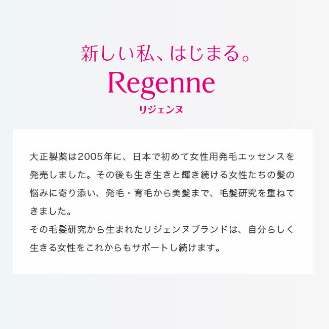 お店TOP>大正製薬 リアップリジェンヌ (60ml*2箱セット)お一人様2セットまで。医薬品に関する注意文言第1類医薬品は、薬剤師が販売し、年齢、他の医薬品の使用状況等について、薬剤師が確認をさせていただき適正に使用されると認められる場合のみ販売をいたします。【医薬品の使用期限】使用期限120日以上の商品を販売しております商品区分:第一類医薬品【大正製薬 リアップリジェンヌの商品詳細】●リアップジェンヌは、女性の壮年性脱毛症に対して、効能・効果が認められた「医薬品」です。●女性の頭皮に着目し、発毛成分ミノキシジルに加え、頭皮環境をととのえる成分を配合しました。●壮年性脱毛症とは男性だけでなく女性にも見られる一般的に遺伝性の薄毛又は抜け毛で、ゆっくりと何年もかかって進行します。普通、髪は2〜6年程度をかけて太くしっかりと成長しますが、壮年性脱毛症の方では、その成長期が短くなってしまうため、細く短い毛になってしまいます。早い人では20代から発症することもあります。●有効成分ミノキシジルの効果ミノキシジルは、壮年性脱毛症の毛包に直接作用して細胞の増殖やタンパク質の合成を促します。その結果、新しい毛髪が生まれ、また抜けにくい太くしっかりとした毛髪が育ちます。●さらに女性の頭皮環境を整える成分を配合パントテニールエチルエーテル、トコフェロール酢酸エステル、l-メントール添加物:1.3-ブチレングリコール、クエン酸、エタノール、ヒアルロン酸Na●販売名:リアップリジェンヌ【効能 効果】壮年性脱毛症における発毛、育毛及び脱毛(抜け毛)の進行予防。【用法 用量】成人女性(20歳以上)が、1日2回、1回1mLを脱毛している頭皮に塗布してください。1回1mLのご使用は、脱毛範囲の大小に関係なくお守りください。1mLは塗り広げれば、頭皮全体に十分に行きわたる量として設計してあります。なお、容器は1mLを計量できるタイプです。★注意1.用法・用量の範囲より多量に使用しても、あるいは頻繁に使用しても効果はあがりません。定められた用法・用量を厳守してください。 (決められた以上に多く使用しても、効果の増加はほとんどなく、副作用の発現する可能性が高くなります。)2.目に入らないように注意してください。万一、目に入った場合には、すぐに水又はぬるま湯で洗ってください。なお、症状が重い場合には眼科医の診療を受けてください。【成分】100mL中成分:分量ミノキシジル:1.0gパントテニールエチルエーテル:1.0gトコフェロール酢酸エステル:0.08gl-メントール:0.3g添加物:1.3-ブチレングリコール、クエン酸、エタノール、ヒアルロン酸Na【注意事項】★してはいけないこと守らないと現在の症状が悪化したり、副作用が起こる可能性があります。1.次の人は使用しないでください(1)本剤又は本剤の成分によりアレルギー症状を起こしたことがある人。(2)未成年者(20歳未満)。(3)妊婦又は妊娠していると思われる人、並びに授乳中の人。(4)妊娠、出産に伴い脱毛している人。(5)避妊用ピルの使用をやめたことにより脱毛している人。(6)壮年性脱毛症以外の脱毛症(例えば、甲状腺疾患、急激なダイエット、円形脱毛症等)の人、あるいは原因のわからない脱毛症の人。(7)頭頂部だけでなく、側頭部や後頭部も含めた頭部全体が脱毛している人。(8)脱毛が急激であったり、髪が斑状に抜けている人。(9)頭皮から強く引っ張るような髪型によって脱毛している人。(10)男性。2.次の部位には使用しないでください(1)本剤は頭皮にのみ使用し、内服しないでください。(2)きず、湿疹あるいは炎症(発赤)等がある頭皮。3.本剤を使用する場合は、他の育毛剤及び外用剤(軟膏、液剤等)の頭皮への使用は、さけてください。また、これらを使用する場合は本剤の使用を中止してください。これらの薬剤は本剤の吸収に影響を及ぼす可能性があります。★相談すること1.次の人は使用前に医師又は薬剤師に相談してください(1)今までに薬や化粧品などによりアレルギー症状(例えば、発疹・発赤、かゆみ、かぶれ等)を起こしたことがある人。(2)高血圧の人、低血圧の人。(3)心臓又は腎臓に障害のある人。(4)むくみのある人。(5)家族、兄弟姉妹に壮年性脱毛症の人がいない人。(6)高齢者(65歳以上)。(7)次の診断を受けている人。甲状腺機能障害(甲状腺機能低下症、甲状腺機能亢進症)。2.使用後、次の症状があらわれた場合は副作用の可能性があるので、直ちに使用を中止し、この説明書を持って医師又は薬剤師に相談してください頭皮の発疹・発赤*、かゆみ、かぶれ、ふけ、使用部位の熱感等、頭痛、気が遠くなる、めまい、胸の痛み、心拍が速くなる、原因のわからない急激な体重増加、手足のむくみ*:頭皮以外にあらわれることもあります。3.6ヵ月間使用して、次のいずれにおいても改善が認められない場合は、使用を中止し、この説明書を持って医師又は薬剤師に相談してください脱毛状態の程度、生毛・軟毛の発生、硬毛の発生、抜け毛の程度。(太い毛