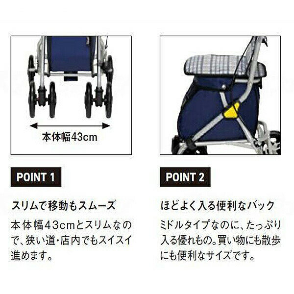 ・本体幅がスリムなシルバーカー ・場所をとらないスリムタイプで収納便利! ・フレームとホイールをバッグに合わせてカラーリング。 ・スリムだけどたっぷり収納 ミドルタイプでありながら、たっぷり収納できるのでお買い物に便利です。 ・安心の手元ブレーキ 両手で握れるので少ない力でもブレーキがきちんと掛かって安心です。 ・生地に合わせたカラーリングでおしゃれ バッグや座面の生地に合わせたフレームとホイールのカラーリングで今までにないおしゃれなシルバーカー。 ●サイズ/ 幅43×奥行50×高さ85〜91.5(無段階)cm 折りたたみ時:奥行34.5×高さ91.5cm 座面:幅26×奥行24cm 座面高:45cm ●車輪サイズ/前輪15×後輪15cm ●重さ/約4.0kg ●材質/ フレーム:アルミ 座面・バッグ:ポリエステル ●バッグ容量/16L ●積載荷重/5kg ●最大使用者体重/80kg ●標準機能/ 折りたたみ、3WAYキャスター(360°・左右45°・固定)、 手元ブレーキ、駐車ブレーキ、座面、杖・傘立て ●SGマーク取得商品 ●カラー/ブラウン チェックブラック ネイビー ●品番/SIMD02 ●JANコード/ ブラウン:4938765005519 チェックブラック:4938765005601 ネイビー:4938765008916 ●メーカー/幸和製作所