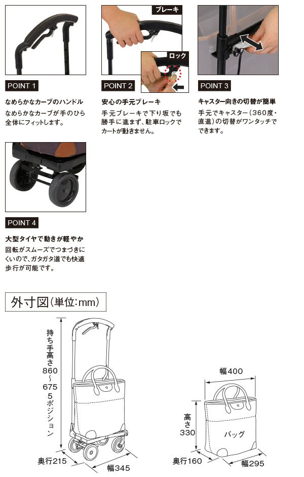 幸和製作所 TacaoF(テイコブ) おとなりカート ブレーキ付きトートタイプ (右利き用) WCC04 本体サイズ 組み立て時:幅34.5×奥行21.5×高さ67.5-86cm折りたたみ時:幅34.5×奥行21.5×高さ63cm重量:約2.7kg 材質 本体:アルミニウム合金バッグ:ナイロン/ポリエステルバッグ持ち手:ポリウレタン 仕様 ●原産国:中国 商品説明 ●最大使用者体重:80kg●最大積載荷重:8kg●持ち手高さ:67.5-86cm (5ポジション)●バッグ寸法:幅40×奥行16×高さ33cm●バッグ容量:約9L●軽い力でスイスイ。安心の手元ブレーキ付き●右利き用●なめらかカーブのハンドルで押しやすい●手元ブレーキで下り坂でも勝手に進まず駐車ロックでカートが動きません●手元でキャスター(360度・直進)の切替がワンタッチで出来ます●大型タイヤで動きが軽やか 商品補足説明 YAMAZEN ヤマゼン 山善 通販 ショッピングカート 歩行補助 キャリーカート キャリー おしゃれ キャリーバッグ 買い物カート 折りたたみ ショッピングバッグ 母の日 49639 49640 496412026/03/11 更新 歩行補助カート コンパクトタイプ ミドルタイプ スタンダードタイプ シルバー用品 ランキング