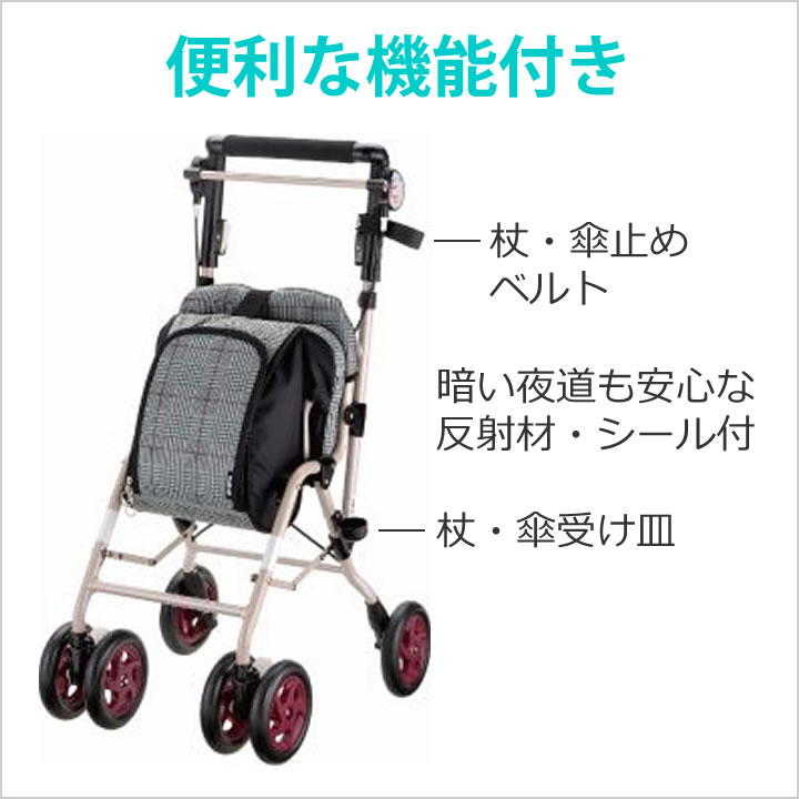 NEW! あると便利なコンパクト車いすの新商品軽さと収納性を兼ね備えた、コンパクトボディを実現 ○たっぷり収納バッグ 買い物に便利です。(容量5L、積載重量4kg) 便利な小物ポケット付きです。 ○ワンタッチ座面 バッグを倒すと、背もたれ付きの腰掛けになります。 座面と背もたれは防水加工です。 ○手元で簡単ブレーキ ハンドルからすぐに指が届くので、下り坂でもスピードが出過ぎず安心です。タイヤがすり減りにくいドラムブレーキ採用。 ハンドブレーキを下方向に倒すと、駐車ロックがかかります。 ○ハンドル高さ3段階調節 左右のボタンを押しながら、高さを3段階の中から選べます。 (85、88、91cm) ○折りたたみ簡単 折りたたみ用レバーを上へ引き上げると、折りたためます。 ○3WAYキャスター角度 路面状況に合わせて、キャスターの回転角度を3段階で切り替えできます。(固定、左右45°、360°) 双輪キャスターで、安定した走行ができます。 ○足元ゆったり設計 広々したスペースがあり、足運びがスムーズにできます。 ○杖・傘止めベルト ○暗い道も安全は反射材・シール付き ○杖・傘受け皿 【サイズ】 ・使用時:43×52×85?91H(cm) ・折りたたみ時:43×30.5×87?93H(cm) ・座面サイズ:幅31×奥行24(cm) ・座面の高さ:44(cm) 【バッグ容量:5L】 【製品重量】3.8kg 【最大使用者体重】80kg 【積載重量】4kg 【材質】 ・フレームパイプ:アルミ ・車輪:ポリプロピレン・EVA樹脂 ・バッグ・座面表生地:ポリエステル ・ハンドル:合成ゴム ケンクル(kenkul)では他にも多くのシルバーカーをご用意しています 軽量で持ち運びに便利お散歩にも最適大きめの袋やかごが付いてお買い物に便利幅が広めでしっかりとした安定感がある体重を支えながら移動できる