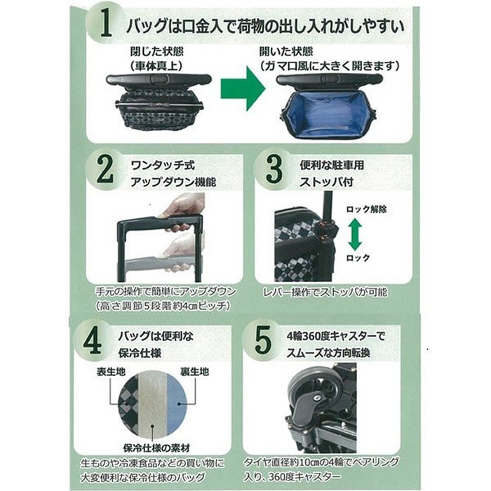 NEW! あると便利なコンパクト車いすの新商品バッグは口金入りで、荷物の出し入れがしやすい。 ※ガマ口風に大きく開きます。 アルミフレームの軽量で持ち運びに便利。 ◆ワンタッチアップダウン機能(高さ5段階 約4cmピッチ) ◆レバー操作でストッパが可能です。 ◆4輪ともベアリング入りで360度スムースに動きます。 ◆バッグは、生ものや冷凍食品の買い物に便利な保冷仕様。 ※バッグの形状上、完全保冷ではございません。 ※こちらの商品はショッピングカートです。歩行を補助するものではありません。 <<サイズ>> 使用時:約H68〜84×W23.5×D34cm5段階高さ調整(ピッチサイズ約4cm) 収納時:約H65×W23.5×D34cm バッグ:約H33×W17×D34cm(外寸) バッグ積載量:6kg 重量:約2.4kg ケンクル(kenkul)では他にも多くのシルバーカーをご用意しています 軽量で持ち運びに便利お散歩にも最適大きめの袋やかごが付いてお買い物に便利幅が広めでしっかりとした安定感がある体重を支えながら移動できる