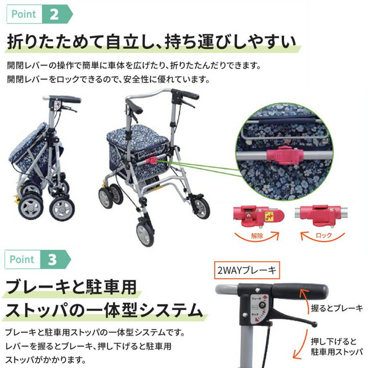 NEW! あると便利なコンパクト車いすの新商品狭い場所でも小回りがきく。使用時も収納時もコンパクトなBOX歩行車○カゴ受け付きお買い物カゴが置けるカゴ受け付きで、カートのままお買い物ができます。バッグは10kgの荷物が入れられる大容量。○折りたためて自立折りたためて自立するので、収納や持ち運びに便利です。開閉レバーの操作で簡単に車体を広げたり、折りたたんだりできます。開閉レバーをロックできるので、安全性に優れています。○ブレーキと駐車用ストッパーの2WAYブレーキブレーキと駐車用ストッパーの一体型です。レバーを握るとブレーキ、押し下げると駐車用ストッパがかかります。○3WAYキャスターシーンに合わせて車輪の動く角度を3種類から選べます。直進固定(0度)、左右各60度、フリー(360度)○自動改札のような狭い場所でも通れます。<材質>本体:アルミ(一部スチール)、粉体塗装タイヤ:EVAホイル:PPバッグ:綿(PVCコーティング)、ポリエステル仕様表サイズ約幅47.5×奥行59×高79〜88cm重量約6.0kg詳細収納時サイズ:約幅47.5×奥行40.5×高71cm高さ調節:4段階(ピッチサイズ約3cm)座面高:約50cm座面サイズ:約幅28×奥行30cmタイヤ直径:前輪約14.5cm、後輪約14.5cmバッグサイズ:約幅27×奥行28×高18cm(外寸)バック載荷重:10kg最大使用者体重:75kg規格1台 ケンクル(kenkul)では他にも多くのシルバーカーをご用意しています 軽量で持ち運びに便利お散歩にも最適大きめの袋やかごが付いてお買い物に便利幅が広めでしっかりとした安定感がある体重を支えながら移動できる