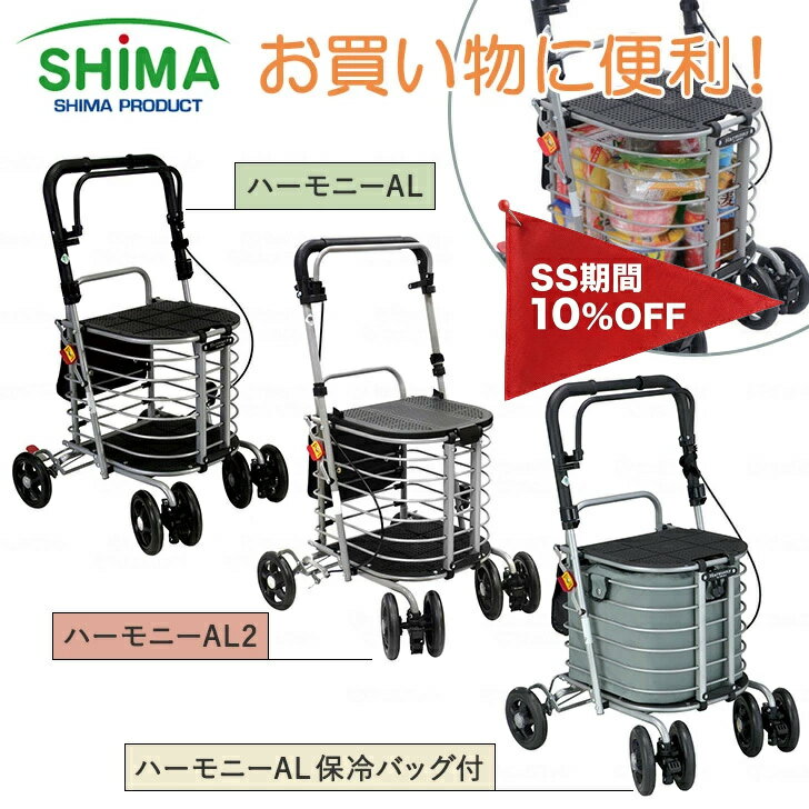 島製作所 ハーモニーAL + 保冷バッグセット軽量 アルミ製 シルバーカー ショッピングカー ショッピングカート 座れる ギフト 母の日 敬老の日 老人車 手押し車 高齢者 買い物 外出 折りたたみ 自立